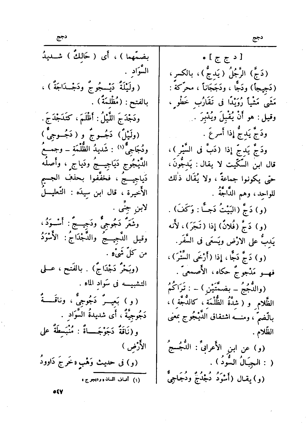 وشَعَرٌ} - دَجُوجِيٌّ {ودَجِيجٌ: أَسْوَدُ، وَقيل} الدَّجِيجُ {والدَّجْدَاجُ: الأَسْوَدُ من كلّ شَيْءٍ.