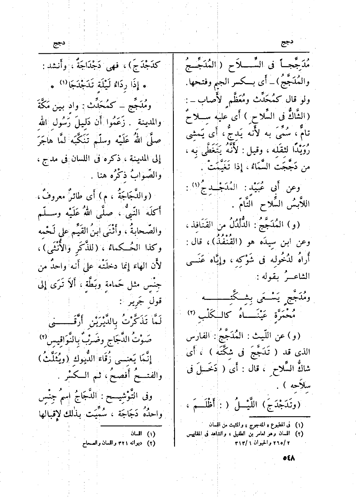 {مُدَجِجَّاً فِي السِّلاح (} المُدَجِّجُ {والمُدَجَّجُ) أَي بِكَسْر الْجِيم وَفتحهَا. وَلَو قَالَ كمُحَدِّث ومُعَظَّمٍ لأَصاب: (الشَّاكُّ فِي السِّلاحِ) أَي عَلَيْهِ سِلاحٌ تامٌّ، سُمِّيَ بِهِ لأَنه} يَدِجُّ، أَي يَمشِي رُوَيْداً لثِقَلِه، وَقيل: لأَنَّهُ يَتَغَطَّى بِه، من {دَجَّجَت السَّمَاءُ، إِذا تَغَيَّمَتْ.
