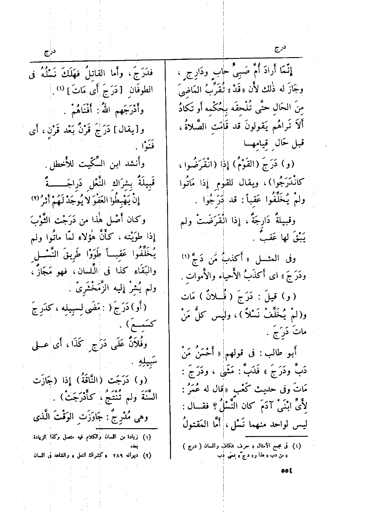 أَبو طَالب: فِي قَوْلهم (أَحْسَنُ مَنْ دَبَّ ودَرَجَ (فَدَبَّ: مَشَى، ودَرَجَ: مَاتَ وَفِي حَدِيث كَعْبٍ (قَالَ لَهُ عُمَرُ: لِأَيِّ ابْنَيْ آدَمَ كَانَ النَّسْلُ؟ فَقَالَ: لَيْسَ لواحدِ مِنْهُمَا نَسْل، أَمَّا المَقتولُ فدَرَجَ، وأَما القاتِلُ فهَلَكَ نَسْلُهُ فِي الطوفَانِ (دَرَجَ أَي مَاتَ) .
