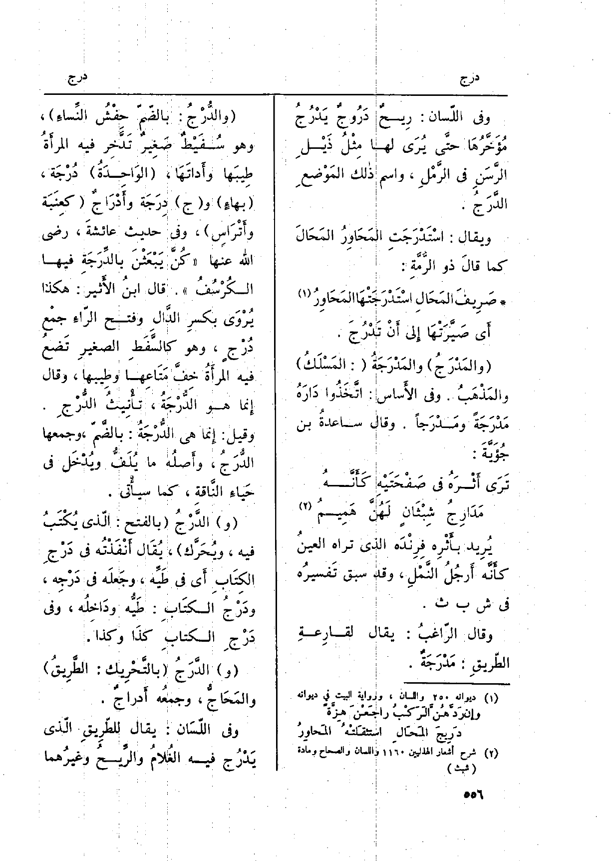 أَي صَيَّرَتْهَا إِلى أَنْ تَدْرُجَ. (الوَاحِدَةُ) دُرْجَة، (بهاءٍ) و (ج) دِرَجَة وأَدْرَاجٌ (كعِنَبَةِ وأَتْرَاسٍ) ، وَفِي حَدِيث عائشةَ، رَضِي الله عَنْهَا (كُنَّ يَبْعَثْنَ بالدَّرَجَةِ فِيهَا الكُرْسُفُ) . قَالَ ابنُ الأَثير: هَكَذَا يُرْوَى بكسرِ الدَّالِ وَفتح الرّاءِ جمْع دُرْجٍ، وَهُوَ كالسَّفَطِ الصغيرِ تَضعُ فِيهِ المرأَةُ خِفَّ مَتَاعِها وطِيبها، وَقَالَ إِنما هُوَ الدُّرْجَةُ، تأَنِيثُ الدُّرْجِ. وَقيل: إِنما هِيَ الدُّرْجَةُ: بالضَّمّ، وَجَمعهَا الدُّرَجُ، وأَصلُه مَا يُلَفُّ ويُدْخَل فِي حَياءِ النَّاقةِ، كَمَا سيأْتي.