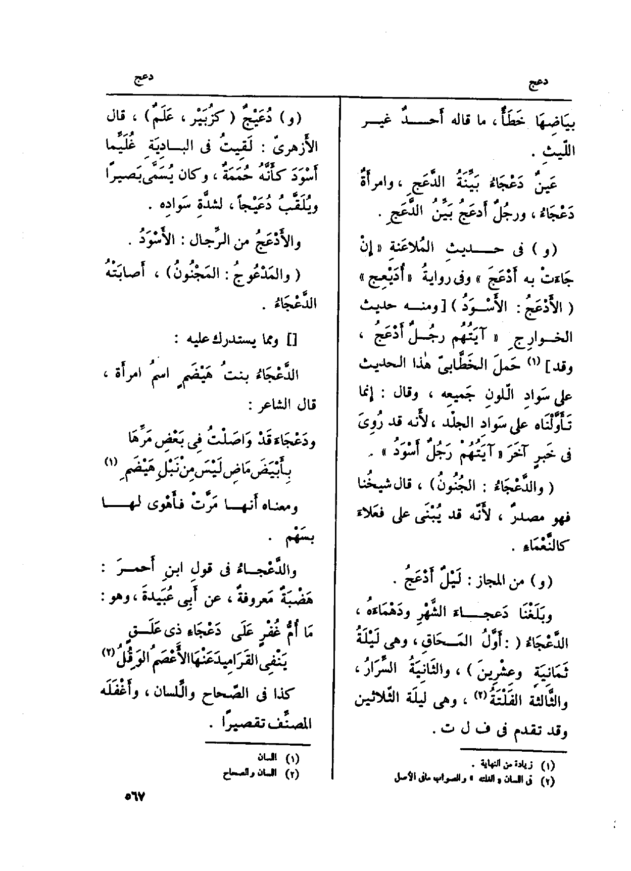 (و) فِي حديثِ المُلاعَنةِ (إِنْ جَاءَتْ بِهِ أَدْعَجَ) وَفِي روايةُ (أُدَيْعِج) (الأَدْعَجُ: الأَسْوَدُ) (وَمِنْه حَدِيث الخوارِجِ (آيَتُهُم رجُلٌ أَدْعَجُ، وَقد) حَملَ الخَطَّابيّ هاذا الحَدِيث على سَوادِ الّلونِ جَميعِه، وَقَالَ: إِنما تَأَوَّلْنَاه على سَوادِ الجلْد، لأَنه قد رُوِيَ فِي خَبرٍ آخَرَ (آيَتُهُمْ رَجُلٌ أَسْوَدُ) .