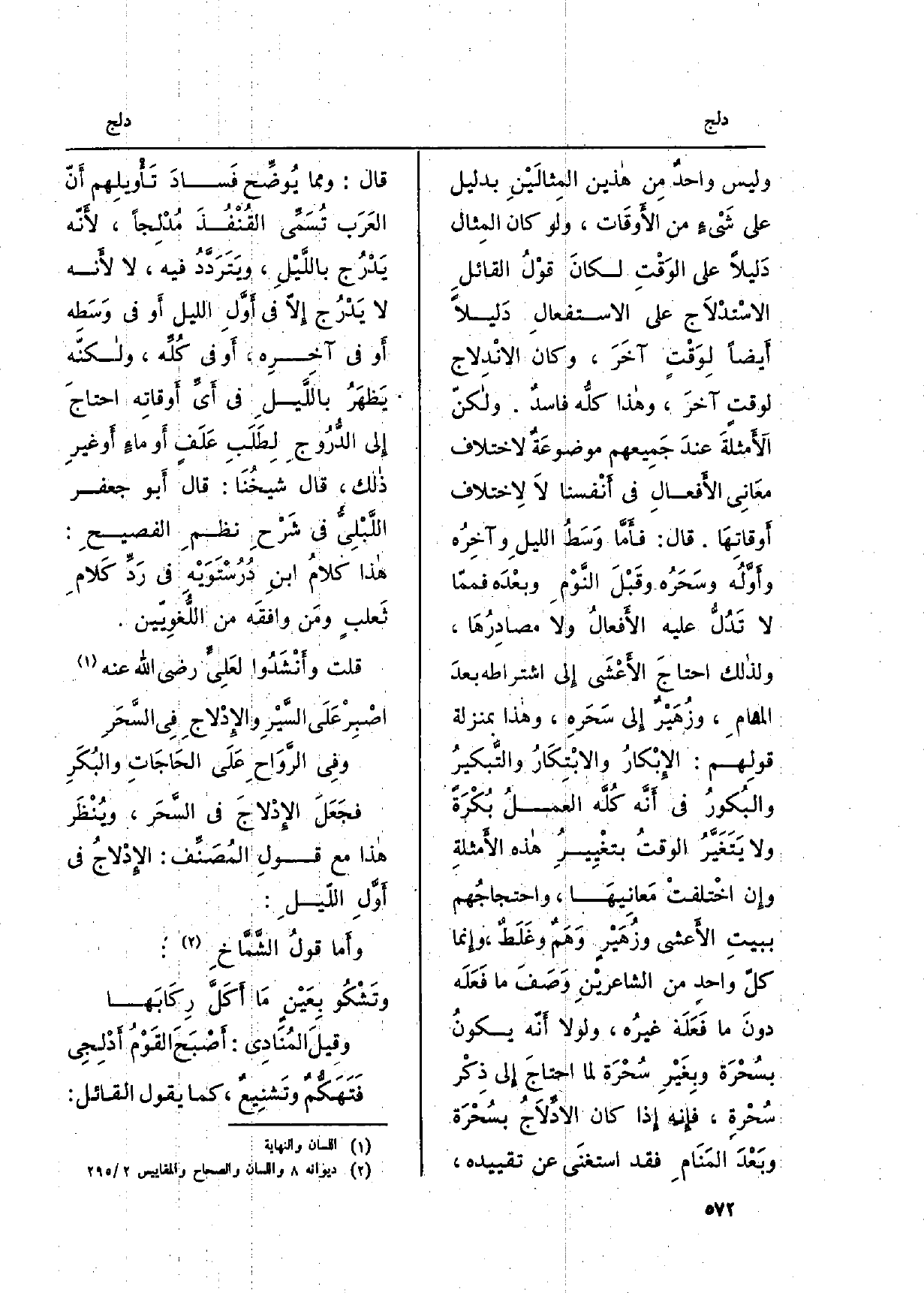 وَلَيْسَ واحدٌ مِن هاذين المِثالَيْنِ بِدَلِيل على شَيْءٍ من الأَوقَات، وَلَو كَانَ المِثال دَليلاً على الوَقْتِ لكانَ قوْلُ القائلِ الاسْتدْلاَج على الاستفعالِ دَليلاً أَيضاً لِوَقْتٍ آخَرَ، وَكَانَ الانْدِلاج لوقتٍ آخَرَ، وهاذا كلُّه فاسدٌ. ولاكنّ الأَمثلةَ عندَ جَمِيعهم موضوعَةٌ لاخْتِلَاف مَعَانِي الأَفعالِ فِي أَنْفسنا لاَ لاِختلاف أَوقاتِهَا. قَالَ: فأَمَّا وَسَطُ الليلِ وآخِرُه وأَوَّلُه وسَحَرُه وقَبْلَ النَّوْمِ وبعْدَه فممّا لَا تَدُلُّ عَلَيْهِ الأَفعالُ وَلَا مصادِرُهَا، ولذالك احتاجَ الأَعْشَى إِلى اشْتِرَاطه بعدَ المهامِ، وزُهَيْرٌ إِلى سَحَرِه، وهاذا بِمَنْزِلَة قولِهم: الإِبْكارُ والابْتِكَارُ والتَّبكيرُ والبُكورُ فِي أَنَّه كُلَّه العملُ بُكْرَةً وَلَا يَتَغَيَّرُ الوقتُ بتغْيِيرُ هاذه الأَمثلةِ وإِن اخْتلفتْ مَعانِيهَا، واحتجاجُهم ببيتِ الأَعشى وزُهَيْرٍ وَهَمٌ وغَلَطٌ، وإِنما كلّ واحدٍ من الشاعريْنِ وَصَفَ مَا فَعَلَه دونَ مَا فَعَلَه غيرُه، وَلَوْلَا أَنّه يكونُ بسُحْرَة وبِغَيْرِ سُحْرَة لما احتاجَ إِلى ذِكْر سُحْرةٍ، فإِنه إِذا كَانَ الادِّلاَجُ بسُحْرَة وبَعْدَ المَنَامِ فقد استغنَى عَن تَقْيِيده، قَالَ: وَمِمَّا يُوضِّح فعسادَ تَأْويلِهم أَنّ العَرَب تُسَمِّى القُنْفُذَ مُدْلِجاً، لأَنّه يَدْرُج باللَّيْلِ، ويَتَرَدَّدُ فِيهِ، لَا لأَنه لَا يَدْرُج إِلاّ فِي أَوَّلِ اللَّيْل أَو فِي وَسَطِه أَو فِي آخِرِه، أَو فِي كُلِّه، ولاكنّه يَظهَرُ باللَّيلِ فِي أَيِّ أَوقاتِه احتاجَ إِلى الدُّرُوجِ لِطَلَبِ عَلَفٍ أَو ماءٍ أَو غيرِ ذالك، قَالَ شيخُنَا: قَالَ أَبو جَعْفَر الَّبْلِيُّ فِي شَرْحِ نظمِ الفصيحِ: هاذا كلامُ ابنِ دُرُسْتَوَيْه فِي رَدِّ كَلامِ ثَعلبٍ ومَن وافقَه من اللُّغوِيّين.