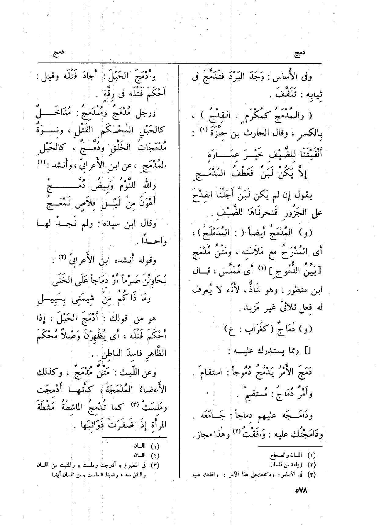 (و) المُدْمَجُ أَيضاً (: المُدَمْلَجُ) ، أَي المُدْرَجُ مَعَ مَلاَسَتِه، ومَتْنُ مُدْمَج (بَيِّنُ الدُّمُوجِ) أَي مُمَلَّس، قَالَ ابْن مَنْظُور: وَهُوَ شَاذٌّ، لأَنّه لَا يُعرف لَهُ فِعل ثلاثيّ غير مَزيد.