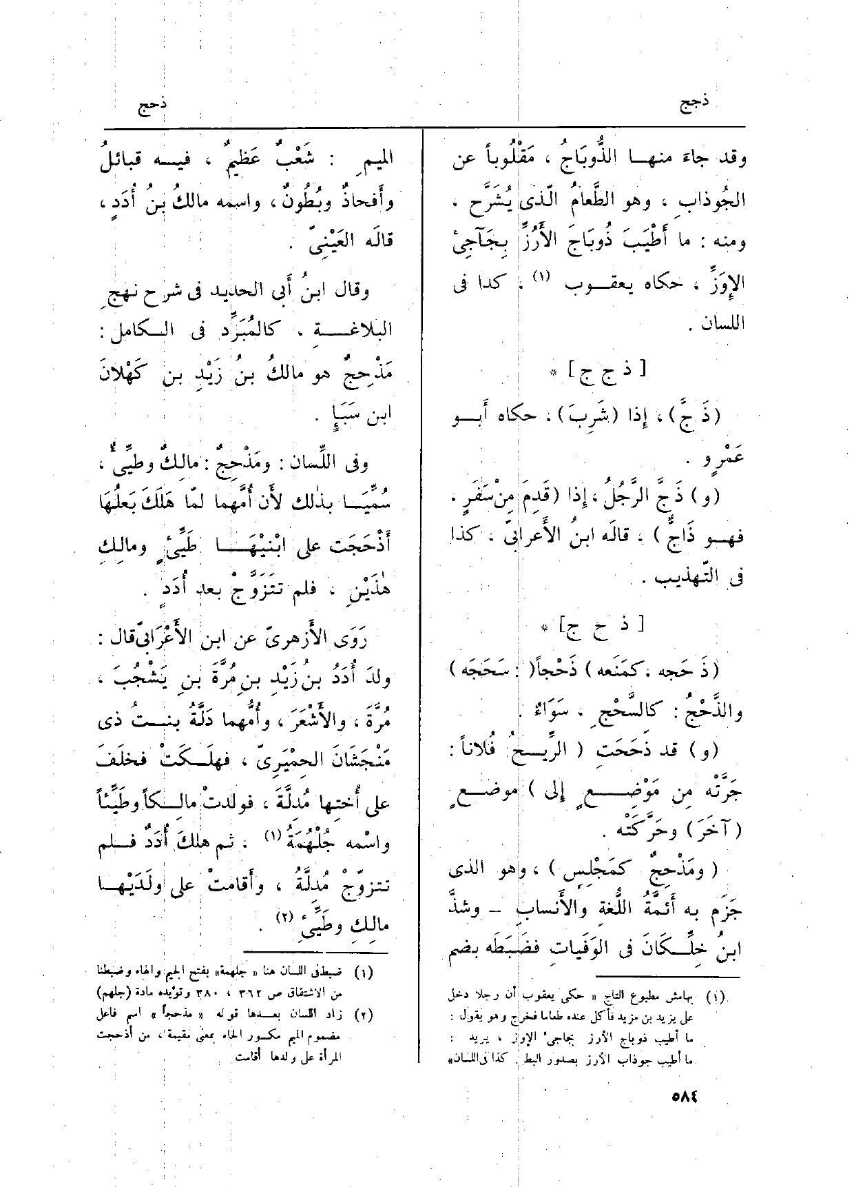 وَفِي اللِّسان: ومَذْحِجٌ: مالِكٌ وطيِّىءٌ، سُمِّيَا بذالك لأَن أُمهما لمّا هَلَكَ بَعلُهَا أَذْحَجَت على ابْنيْهَا طَيِّىءٍ ومالِكِ هاذَيْنِ، فَلم تتَزَوَّجْ بعد أُدَدٍ.