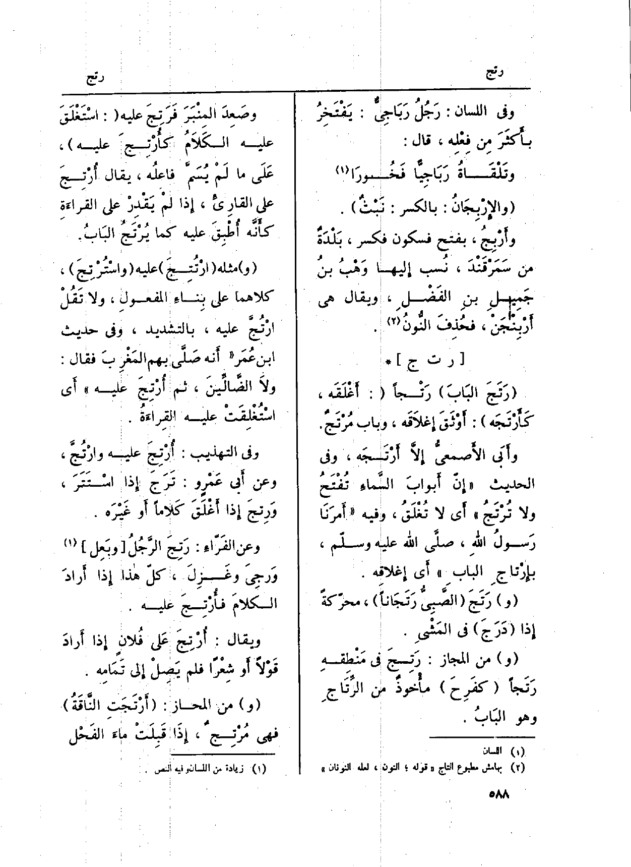 : (رَتَجَ البَابَ) رَتْجاً (: أَغْلَقَه، كَأَرْتَجَ) : أَوْثَقَ إِغلاَقَه، وَبَاب مُرْتَجٌ.