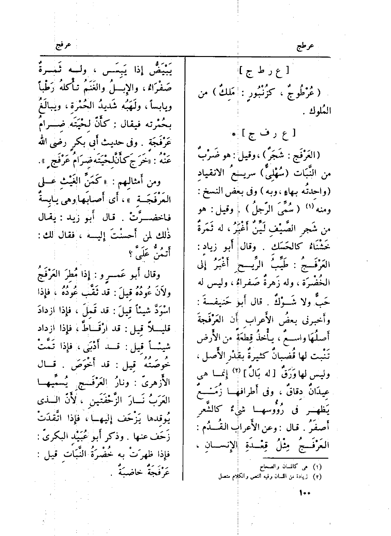 : (العَرْفَج: شَجَرٌ) ، وَقيل: هُوَ ضَرْبٌ من النَّبَات (سُهْلِيٌّ) سريعُ الانقيادِ (واحِدتُه بهاءٍ، وَبِه) وَفِي بعض النّسخ: وَمِنْه (سُمِّيَ الرّجلُ) . وَقيل: هُوَ من شَجرِ الصَّيْفِ لَيِّنٌ أَغْبَرُ، لَهُ ثَمَرةٌ خَشْنَاءُ كالحَسَكِ. وَقَالَ أَبو زيادٍ: العَرْفَجَ: طَيِّبُ الرِّيحِ أَغْبَرُ إِلى الخُضْرَة، وَله زَهرةٌ صَفراءُ، وَلَيْسَ لَهُ حبٌّ وَلَا شَوْكٌ. قَالَ أَبو حَنيفةَ: وأَخبرني بعضُ الأَعرابِ أَن العَرْفَجةَ أَصلُهَا واسعٌ، يأْخذُ قِطعَةً من الأَرض تَنْبت لَهَا قُضبانٌ كثيرةٌ بقدْرِ الأَصل، وَلَيْسَ لَهَا وَرَقٌ (لَهُ بَالٌ) إِنما هِيَ عِيدَانٌ دِقاقٌ، وَفِي أَطرافها زُمَعٌ يَظهر فِي رُؤُوسها شيءٌ كالشَّعرِ أَصفَرُ. قَالَ: وَعَن الأَعراب القُدُم: العَرْفَجُ مِثْلُ قِعْدَةِ الإِنسانِ، يَبْيَضُّ إِذا يَبِسَ، وَله ثَمرةٌ صَفْرَاءُ، والإِبلُ والغَنَمُ تأْكلهُ رَطْباً ويابساً، ولَهَبُه شَديدُ الحُمْرةِ، ويبالَغُ بحُمْرته فَيُقَال: كأَنّ لِحْيَتَه ضِرامُ عَرْفَجَةٍ. وَفِي حَدِيث أَبي بكرٍ رَضِيَ اللَّهُ عنهُ: (خَرَجَ كأَنَّ لِحْيَتَه ضِرَامُ عَرْفَجٍ) .