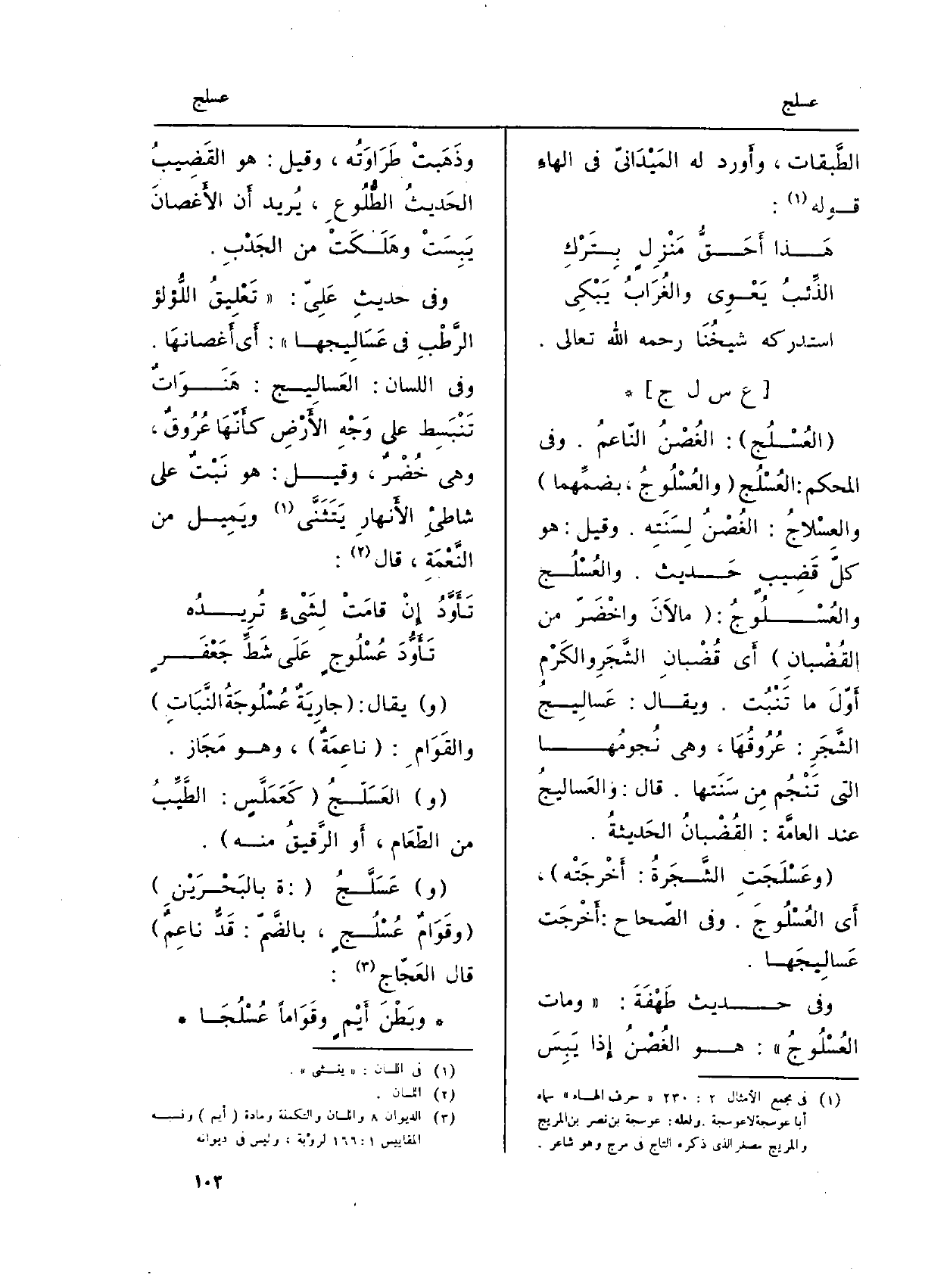 : (العُسْلُج) : الغُصْنُ النّاعمُ. وَفِي (الْمُحكم) : العُسْلُج (والعُسْلُوجُ، بضمِّهما) والعِسْلاجُ: الغُصْنُ لِسَنَتِه. وَقيل: هُوَ كلّ قَضِيبٍ حَديثٍ. والعُسْلُج والعُسْلُوجُ: (مَا لاَنَ واخْضَرّ من القُضْبانِ) أَي قُضْبانِ الشَّجَرِ والكَرْم أَوّلَ مَا تَنْبُت. وَيُقَال: عَسالِيجُ الشَّجَرِ: عُرُوقُهَا، وَهِي نُجُومُها الَّتِي تَنْجُم مِن سَنَتها. قَالَ: والعَساليجُ عِنْد العامَّة: القُضْبانُ الحَديثةُ.