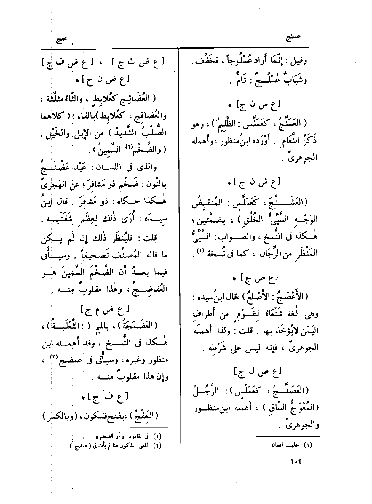قلت: فليُنظَر ذالك إِن لم يكن مَا قَالَه المُصنِّف تَصحيفاً. وسيأْتي فِيمَا بعدُ أَن الضَّخْمَ السَّمينَ هُوَ العُفاضِجُ، وهاذا مقلوبٌ مِنْهُ.