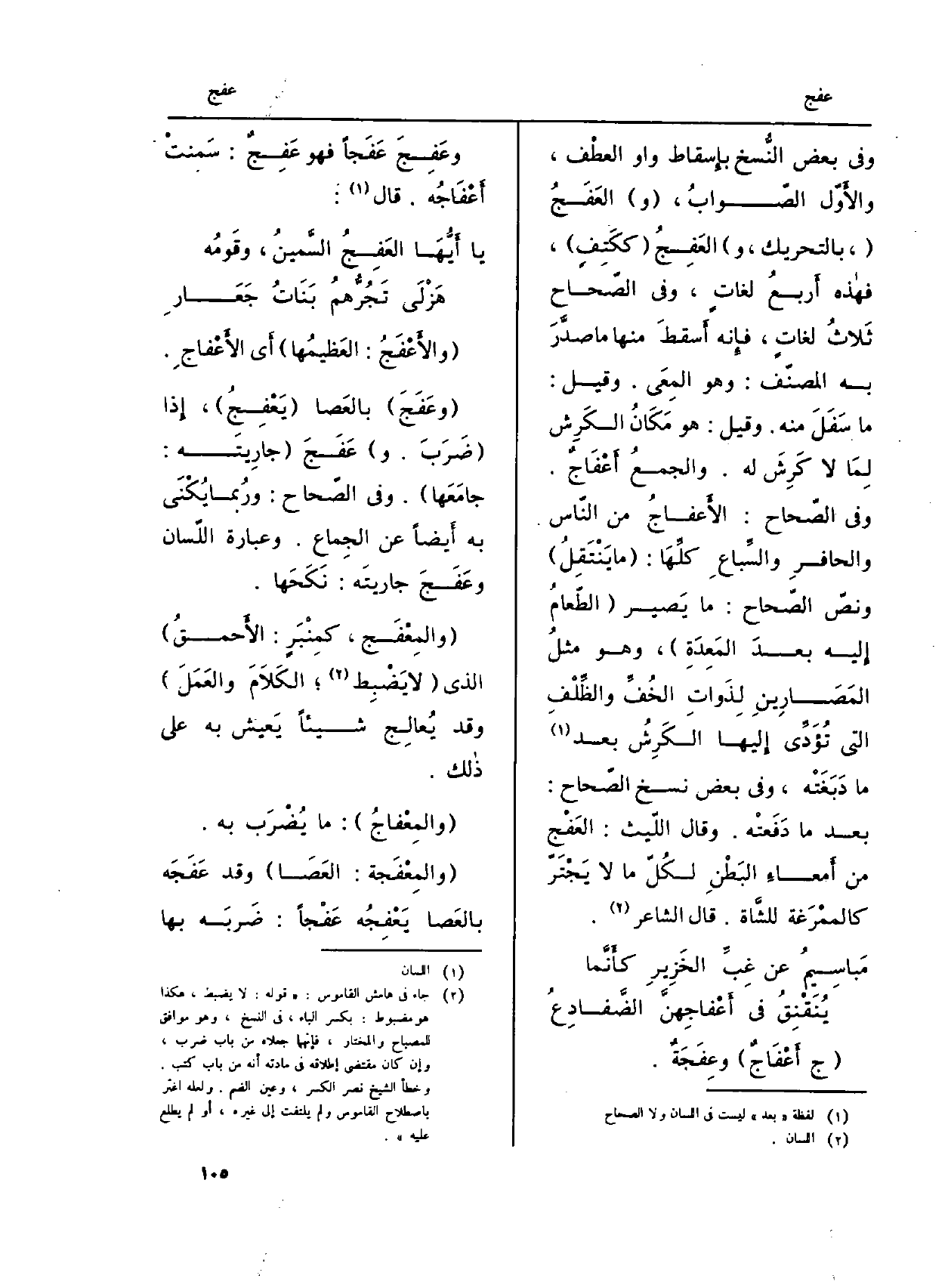 (وعَفَجَ) بالعَصاء (يَعّفِجُ) ، إِذا (ضَرَبَ. و) عَفَجَ (جارِيتَه: جامَعَها) . وَفِي (الصّحاح) : ورُبما يُكْنَى بِهِ أَيضاً عَن الجِماع. وَعبارَة (اللِّسَان) وعَفَجَ جاريتَه: نَكَحَها. (والمِعْفَج، كمِنْبَرٍ: الأَحمقُ) الَّذِي (لَا يَضْبِط؛ الكَلاَمَ والعَمَلَ) وَقد يُعالِج شَيْئا يَعيش بِهِ على ذالك.