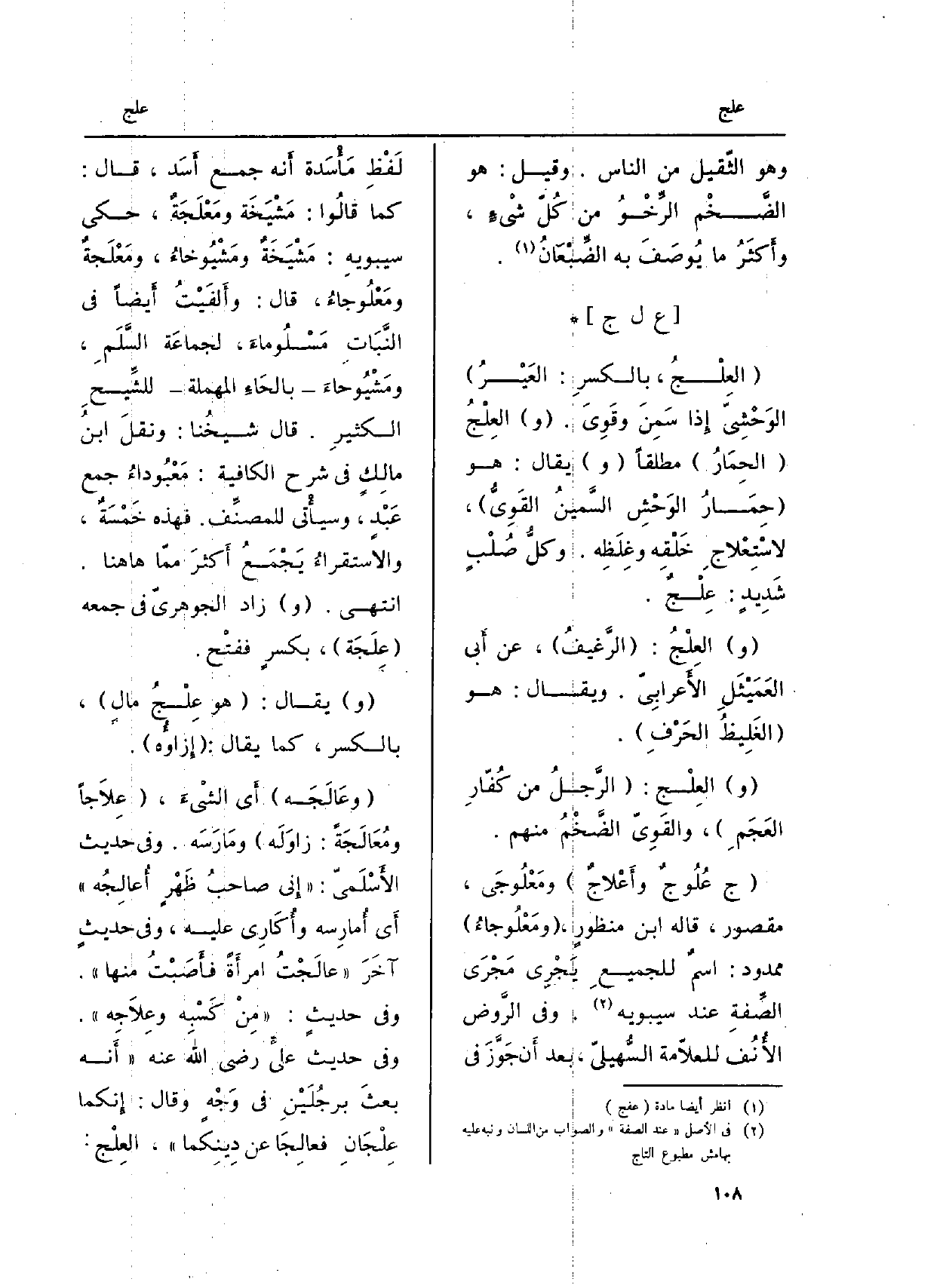 (ج عُلُوجٌ وأَعْلاجٌ) ومَعْلُوجَى، مَقْصُور، قَالَه ابْن منظورٍ، (ومَعْلُوجاءُ) مَمْدُود: اسمٌ للجميعِ يَجْرِي مَجْرَى الصِّفةِ عِنْد سِيبَوَيْهٍ. وَفِي (الرَّوض الأُنُف) للعلاّمة السُّهيليّ، بعد أَن جَوَّزَ فِي لَفْظِ مَأْسَدة أَنه جمع أَسَد، قَالَ: كَمَا قالُوا: مَشْيَخَة وَمَعْلَجَةٌ، حكى سيبويهِ: مَشْيَخَةٌ ومَشْيُوخاءُ، ومَعْلَجةٌ ومَعْلُوجاءُ، قَالَ: وأَلفَيْتُ أَيضاً فِي النَّبَاتِ مَسْلُوماءَ، لجماعَة السَّلَمِ، ومَشْيُوحاءَ بالحَاءِ الْمُهْملَة للشِّيحِ الكثيرِ. قَالَ شيخُنا: ونقلَ ابنُ مالِكٍ فِي (شرح الكافية) : مَعْبُوداءُ جمع عَبْدٍ، وسيأْتي للمصنِّف. فَهَذِهِ خَمْسَةٌ، والاستقراءُ يَجْمَعُ أَكثرَ ممّا هَاهُنَا. انْتهى. (و) زَاد الجوهريّ فِي (جمعه) (عِلَجَة) ، بكسرٍ ففتْح.