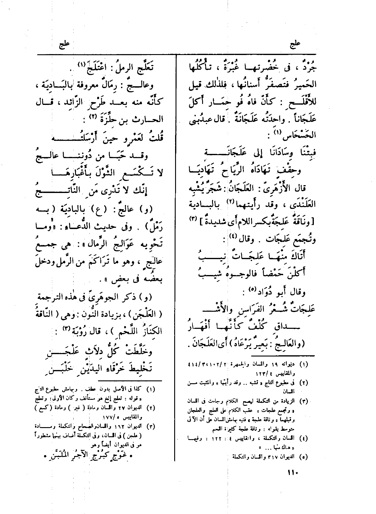 قَالَ الأَزْهَرِيّ: العَلَجَانُ: شَجَرٌ يُشْبِه العَلَنْدَى، وَقد رأَيتهما بالبادية (وناقَةٌ عَلِجَةٌ بِكَسْر اللَّام أَي شديدةٌ) وتُجمَع عَلِجَات. وَقَالَ: