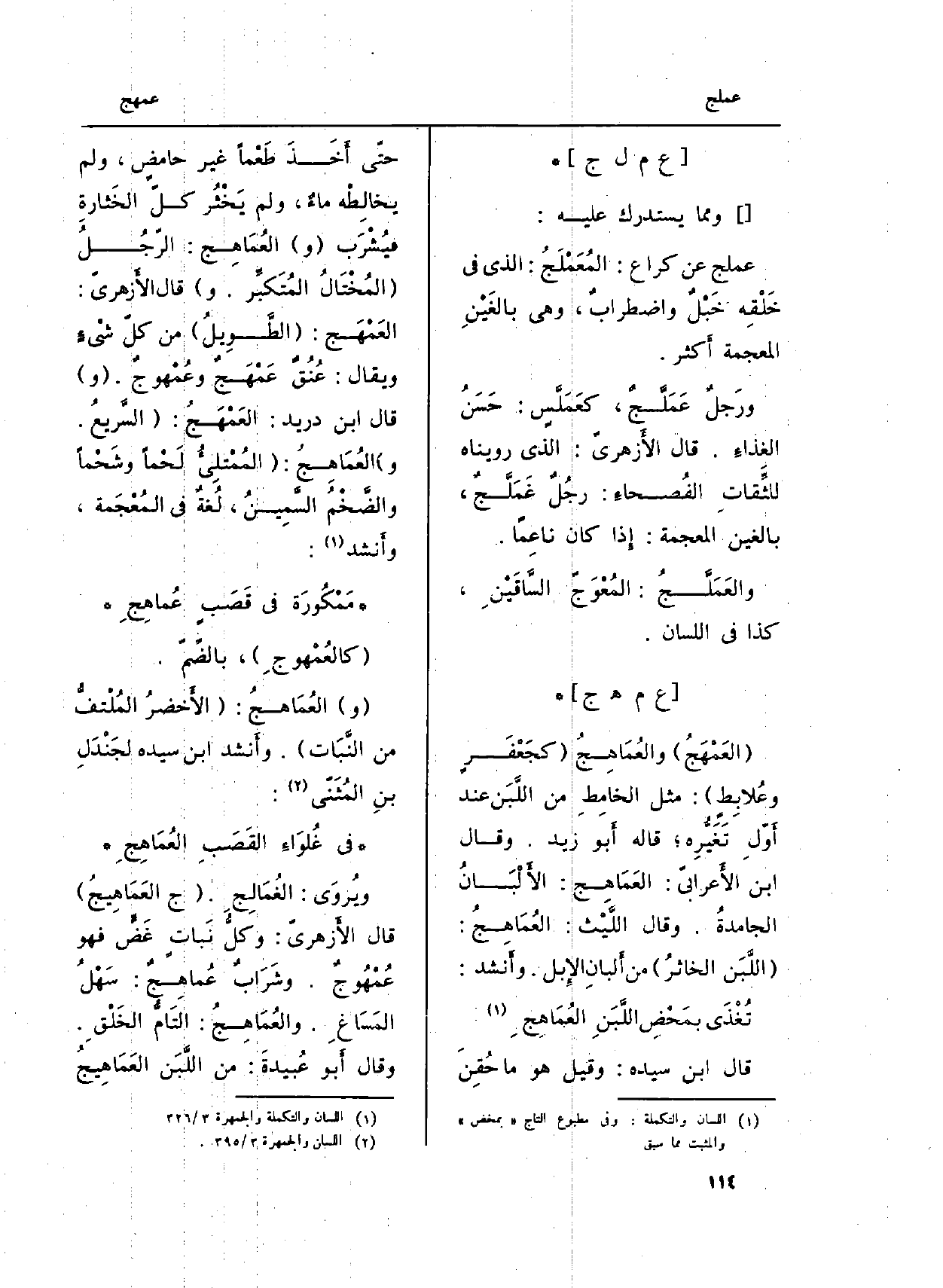 ويُروَى: الغُمَالِجِ. (ج العَمَاهِيجُ) قَالَ الأَزهريّ: وكلُّ نَباتٍ غَضَ فَهُوَ عُمْهُوجٌ. وشَرَابٌ عُمَاهِجٌ: سَهْلُ المَسَاغِ. والعُمَاهِجُ: التَامُّ الخَلْقِ. وَقَالَ أَبو عُبيدةَ: من اللَّبَن العَمَاهِيجُ