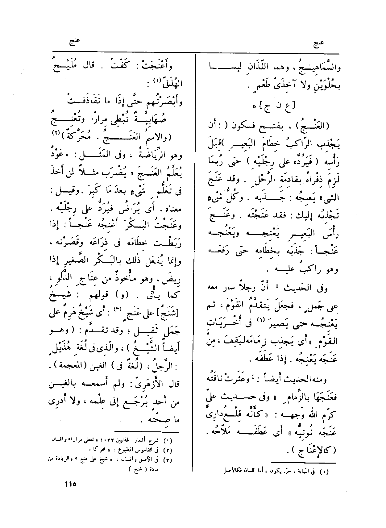 (والاسمُ العَنَجِ، مُحَرَّكةً) وَهُوَ الرِّيَاضَةُ، وَفِي المَثَل: (عَوْدٌ يُعَلَّمُ العَنَجَ) يُضْرَب مثلا لمن أَخذَ فِي تَعَلُّمِ شَيْءٍ بعدَمَا كَبِرَ. وَقيل: مَعْنَاهُ، أَي يُرَاضُ فيُرَدُّ على رِجْلَيْه. وعَنَجْتُ البَكْرَ أَعْنِجُه عَنْجاً: إِذا رَبَطْت خِطَامَه فِي ذرَاعَه وقَصَرْته، وإِنما يُفعَل ذالك بالبَكْر الصَّغيرِ إِذا رِيضَ، وَهُوَ مأْخوذٌ من عِنَاجِ الدَّلْوِ، كَمَا يأْتي. (و) قَوْلهم: شَيخٌ (شَنَجٌ على عَنَجٍ: أَي شَيْخٌ هَرِمٌ على جَمَل ثَقِيل؛ وَقد تقدَّم: (وَهُوَ أَيضاً الشَّيْخُ) ، والّذِي فِي لُغَةِ هُذَيْلٍ: الرَّجلُ، (لُغَةً فِي) الْغَيْن (الْمُعْجَمَة) . قَالَ الأَزهَرِيّ: وَلم أَسمعه بالغين من أَحدٍ يُرْجَع إِلى عِلْمه، وَلَا أَدرِي مَا صِحّته.
