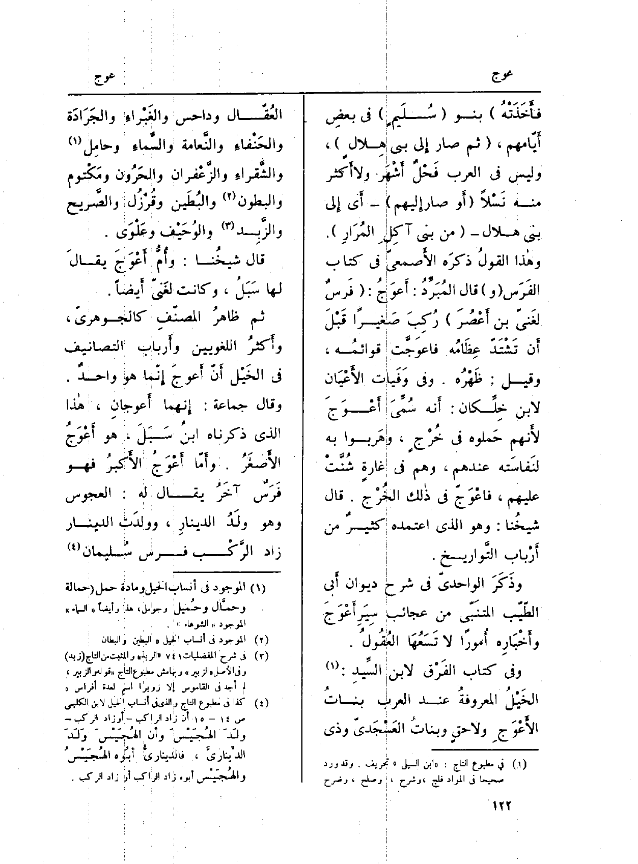 ثمَّ ظاهرُ المصنّفِ كالجوهريّ، وأَكثرُ اللغويين وأَرباب التصانيف فِي الخَيْل أَنّ أَعوجَ إِنّما هُوَ واحدٌ. وَقَالَ جمَاعَة: إِنهما أَعوجانِ، هاذا الَّذِي ذَكرْنَاهُ ابنُ سَبَلَ، هُوَ أَعْوَجُ الأَصغَرُ. وأَمّا أَعْوَجُ الأَكبرُ فَهُوَ فَرَسٌ آخَرُ يُقَال لَهُ: العجوس وَهُوَ ولَدُ الدينارِ، وولدَت الدِّينَار زَاد الرَّكْب فرس سُليمان
