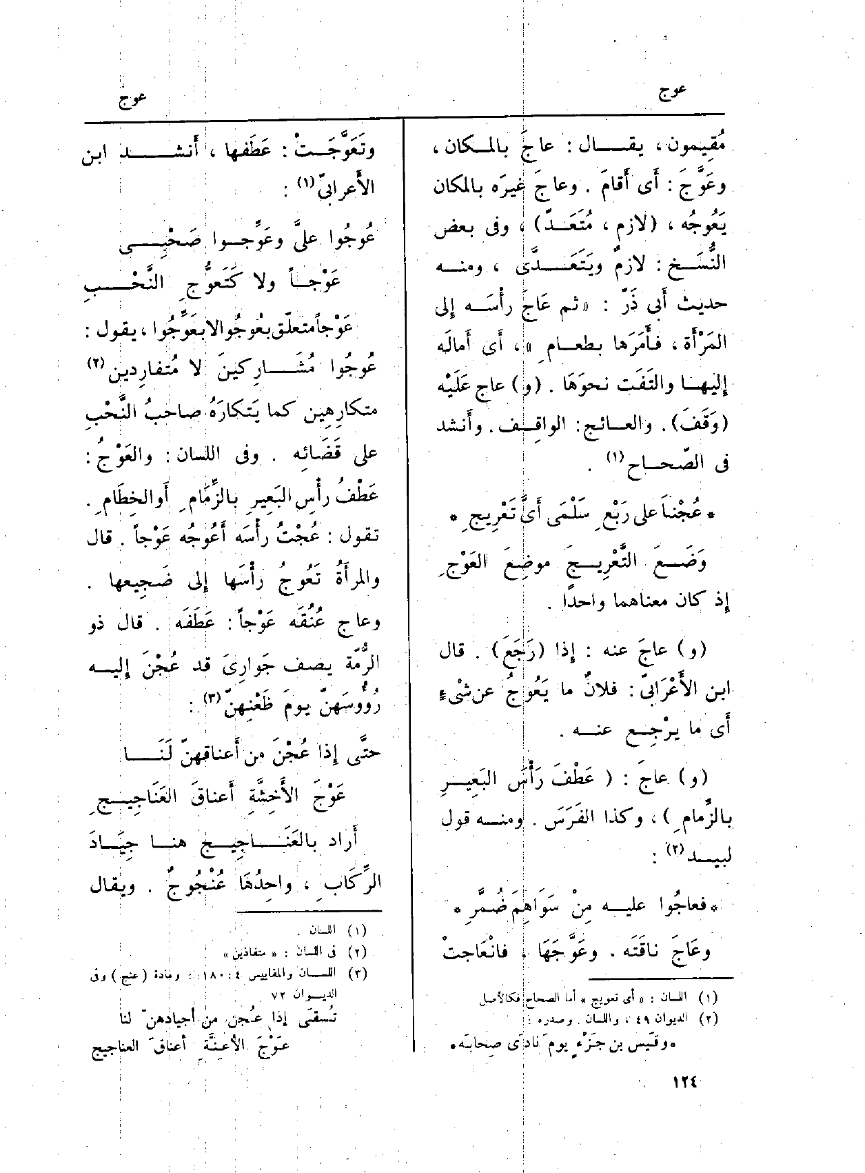 مُقِيمون، يُقَال: عاجَ بِالْمَكَانِ، {وعَوَّجَ: أَي أَقامَ. وعاجَ غيرَه بِالْمَكَانِ يَعُوجُه، (لَازم، مُتَعَدّ) ، وَفِي بعض النُّسَخ: لازمٌ ويَتَعَدَّى، وَمِنْه حَدِيث أَبي ذَرّ: (ثمَّ عَاجَ رأْسَه إِلى المَرْأَة، فأَمَرَها بطعامِ) ، أَي أَمالَه إِليهما والتَفَت نحوَهَا. (و) عاج عَلَيْه (وَقَفَ) . والعائج: الواقِف. وأَنشد فِي (الصّحاح) .