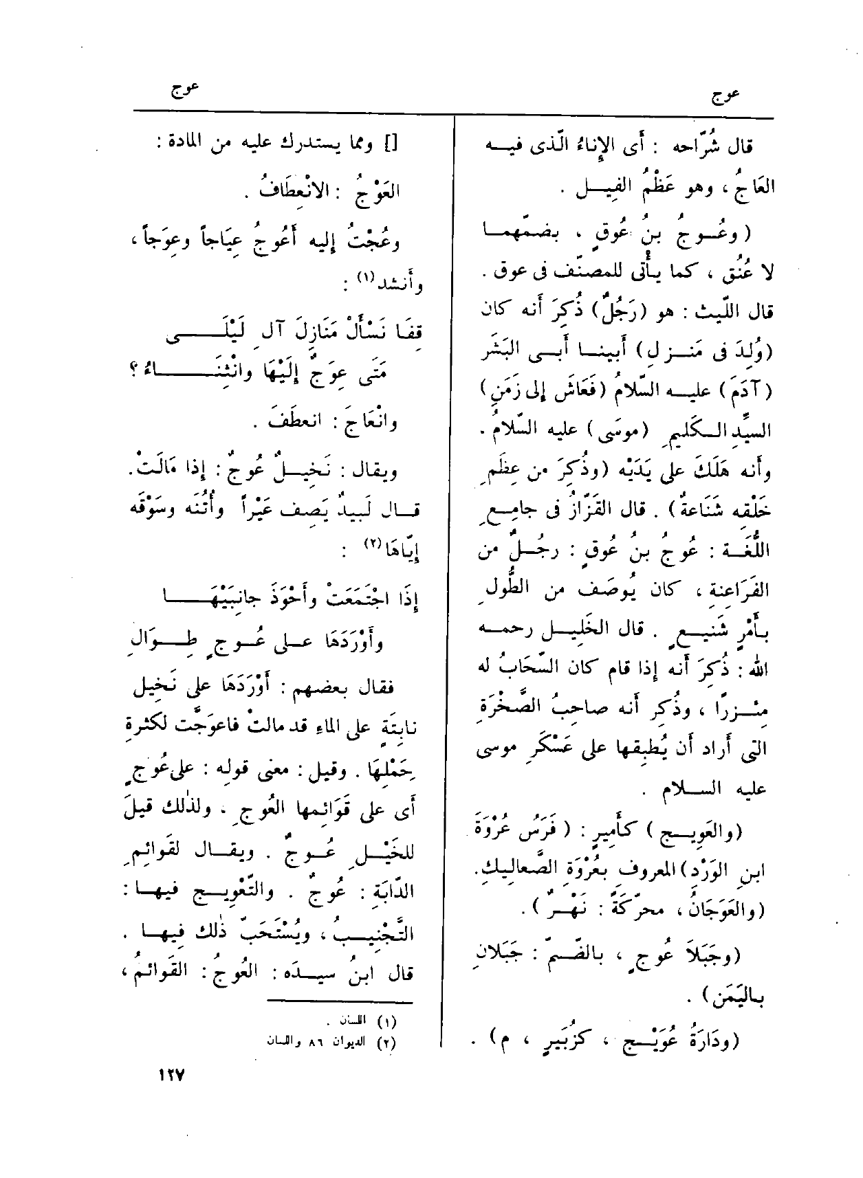 (} والعَوِيج) كأَمِيرٍ: (فَرَسُ عُرْوَةَ بن الوَرْدِ) المعروفِ بعُرْوَةِ الصَّعالِيكِ. ( {والعَوَجَانُ، محرّكَةً: نَهْرٌ) .