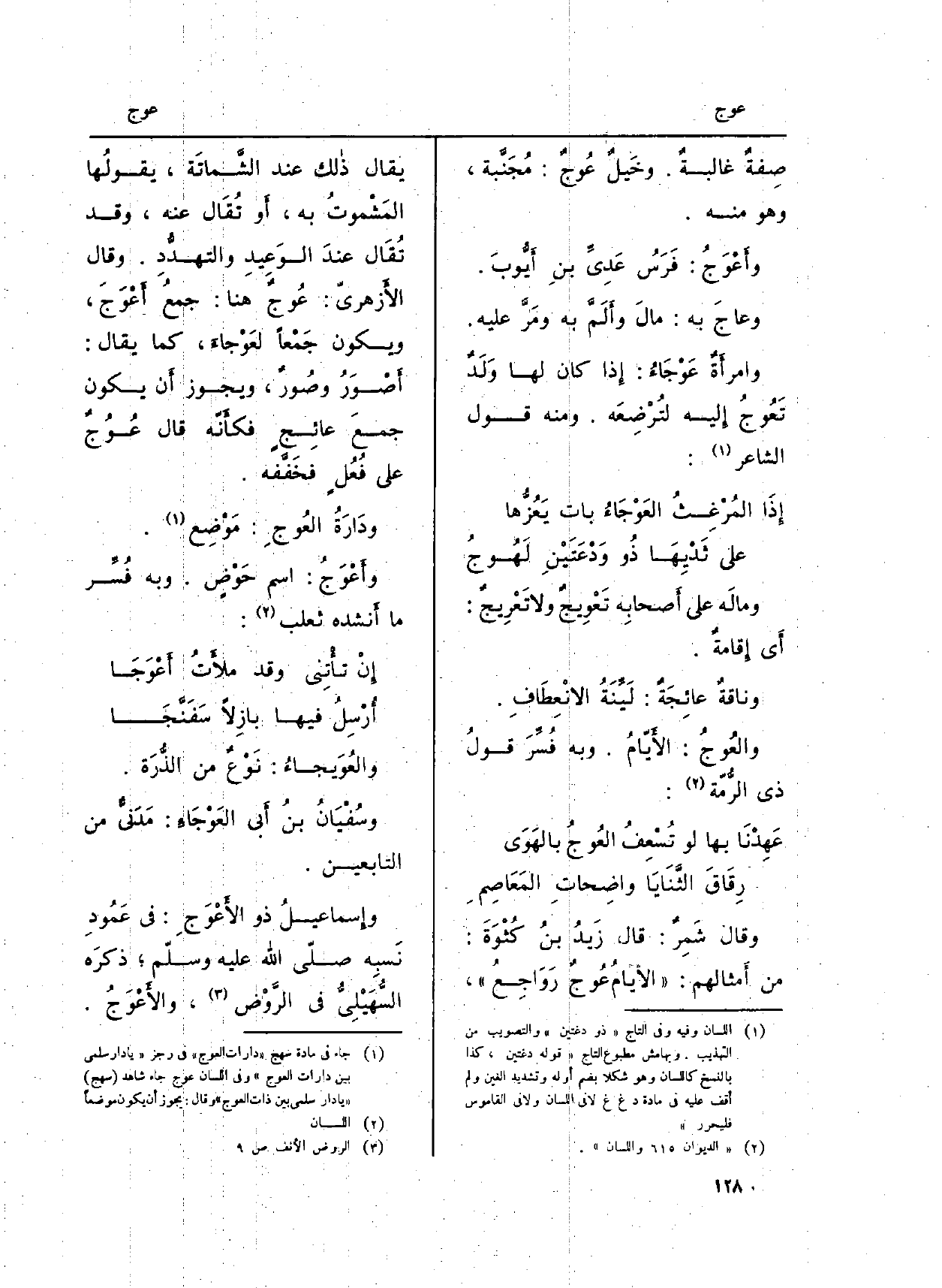 وَقَالَ شَمِرٌ: قَالَ زَيْدُ بنُ كُثْوَةَ: من أَمثالهم: (الأَيّامُ عُوجٌ رَوَاجِعُ) ، يُقَال ذَلِك عِنْد الشَّماتَة، يقولُها المَشْموتُ بِهِ، أَو تُقال عَنهُ، وَقد تُقَال عندَ الوَعِيدِ والتهدُّدِ. وَقَالَ الأَزهريّ: عُوجٌ هُنَا: جمعُ أَعْوَجَ، وَيكون جَمْعاً} لعَوْجَاءَ، كَمَا يُقَال: أَصْوَرُ وصُورٌ، وَيجوز أَن يكون جمعَ {عائِجٍ فكأَنّه قَالَ عُوُجٌ على فُعُلٍ فخَفَّفه.