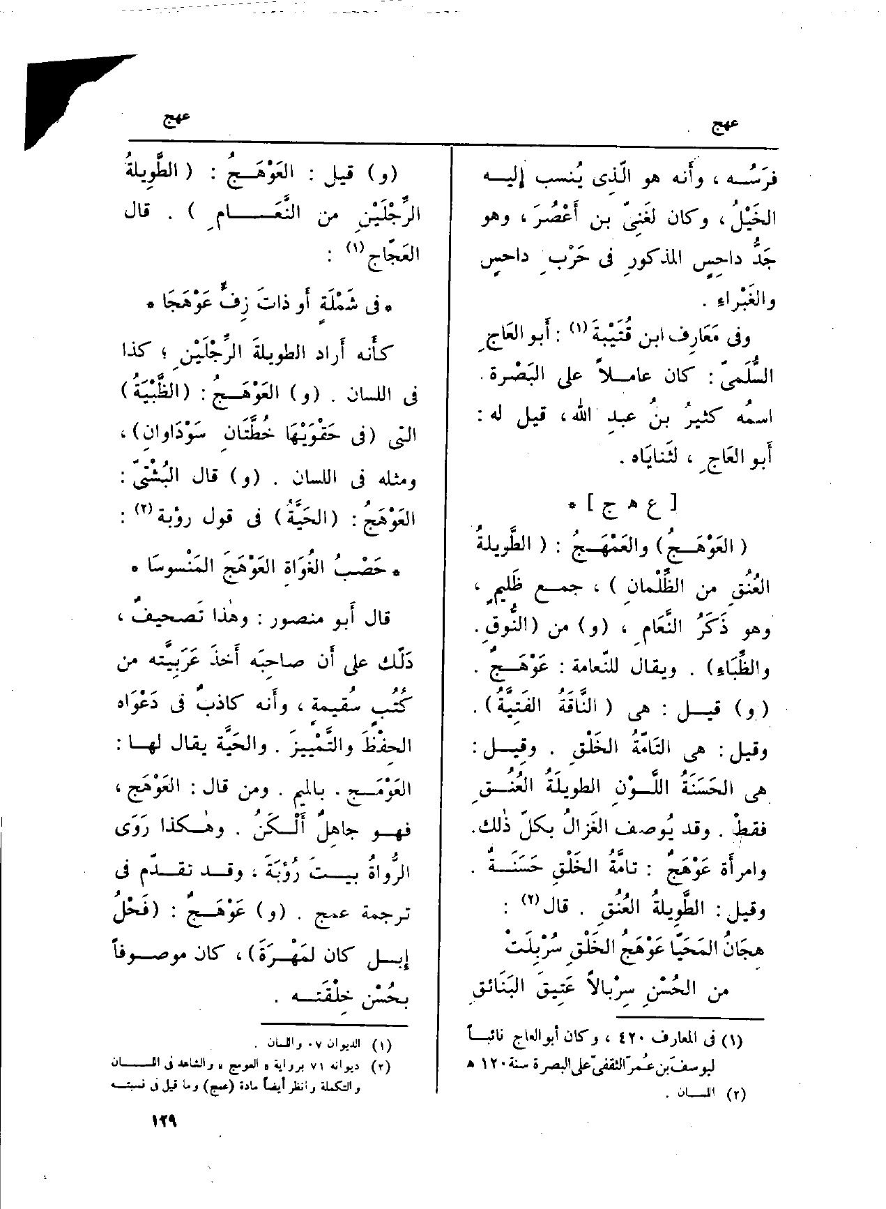 قَالَ أَبو مَنْصُور: وهاذا تَصحيفٌ، دَلّك على أَن صاحِبَه أَخذَ عَرَبِيَّته من كُتُبٍ سُقيمةٍ، وأَنه كاذبٌ فِي دَعْوَاه الحِفْظَ والتَّمْييزَ. والحَيَّة يُقَال لَهَا: العَوْمَج، بِالْمِيم. وَمن قَالَ: العَوْهَج، فَهُوَ جاهِلٌ أَلْكَنُ. وهاكذا رَوَى الرُّواةُ بيتَ رُؤبَةَ، وَقد تقدّم فِي تَرْجَمَة عمج. (و) عَوْهَجٌ: (فَحْلُ إِبل كَانَ لمَهْرَةَ) ، كَانَ مَوْصُوفا بحُسْن حِلْقَته.