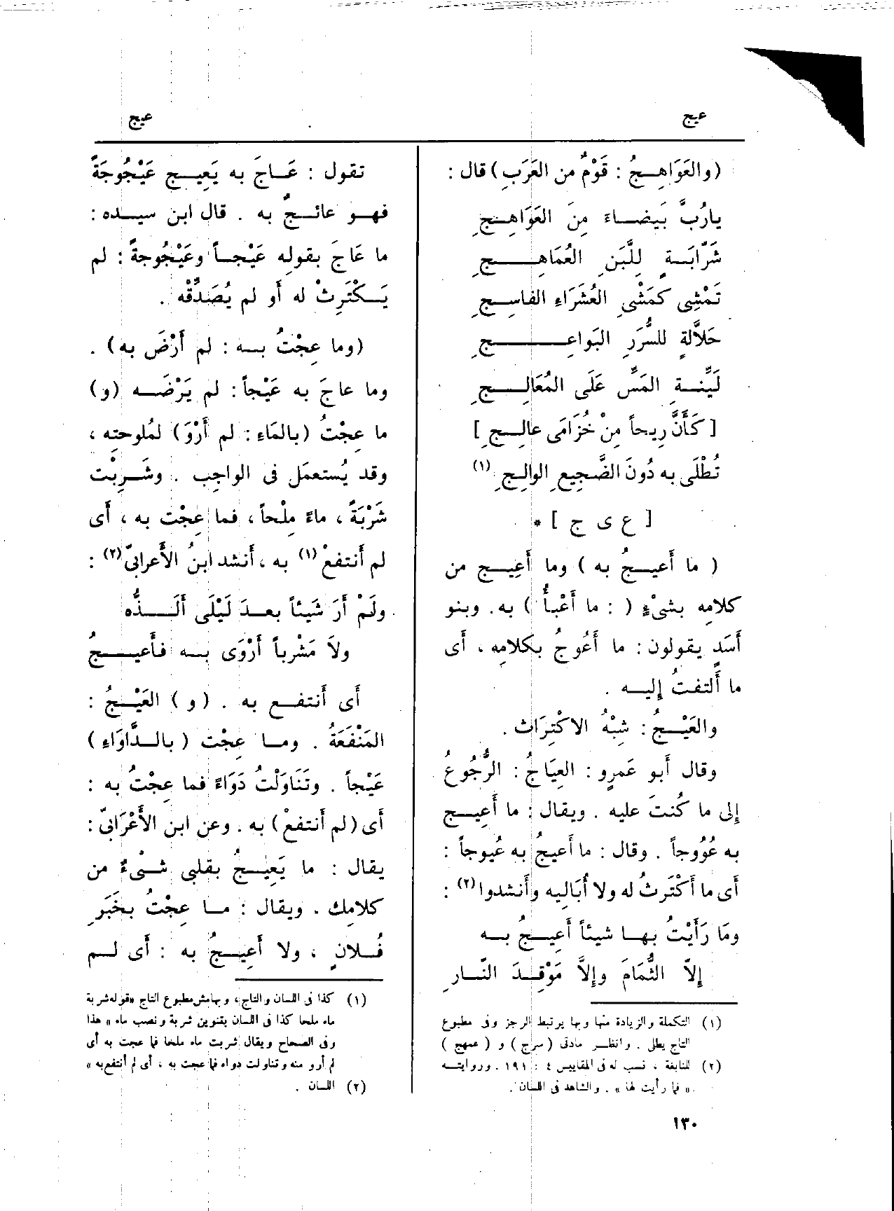 وَقَالَ أَبو عَمرٍ و:} العِيَاجُ: الرُّجُوعُ إِلى مَا كُنتَ عَلَيْهِ. وَيُقَال: مَا أَعِيج بِهِ {عُيُوجاً: أَي مَا أَكْتَرثُ لَهُ وَلَا أُبَالِيه وأَنشدوا: