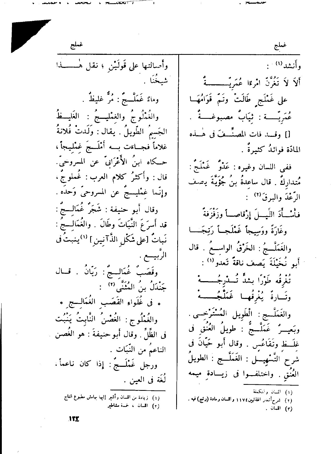 والغُمْلُوجُ والغِمْليجُ: الغَليظُ الجَسِيمُ الطّويلُ. يُقَال: وَلَدتْ فُلانةُ غُلَاما فجاءَت بِهِ أَمْلَجَ غِمْلِيجاً، حَكَاهُ ابنُ الأَعْرَابيّ عَن المسروخيّ. قَالَ: وأَكثرُ كَلَام الْعَرَب: غُمْلوجٌ، وإِنّما غِمْليجٌ عَن المسروحيّ وَحده.