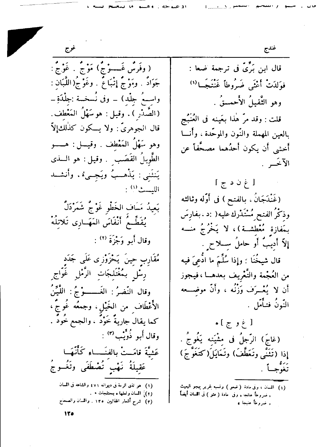 (وفَرسٌ {غَوْجٌ) مَوْجٌ. غَوْجٌ: جَوَادٌ. ومَوْجٌ إِتْبَاعٌ.} وغَوْجُ (اللَّبَانِ واسِعُ جِلْدِ) وَفِي نُسخة: جِلْدَةِ (الصَّدْرِ) ، وَقيل: هُوَ سَهْلُ المَعْطِف. قَالَ الجوهريّ: وَلَا يكون كذالك إِلاّ وَهُوَ سَهْلُ المَعْطِف. وَقيل: هُوَ الطَّوِيلُ القَصَبِ. وَقيل: هُوَ الَّذِي يَنثَنِي: يَذْهَبُ ويَجِيءُ، وأَنشد اللَّيْث: