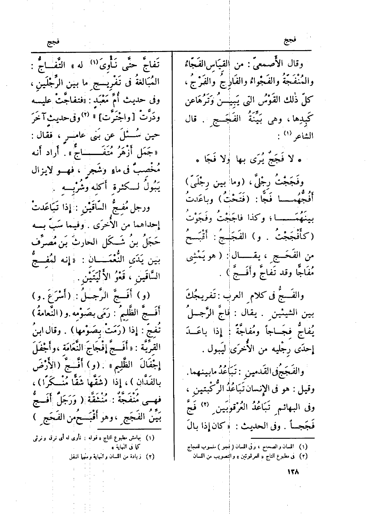 } والفَجَجُ فِي القَدمينِ: تَبَاعُدُ مَا بَينهمَا. وَقيل: هُوَ فِي الإِنسان تَبَاعُدُ الرُّكْبتينِ، وَفِي البهائمِ تَبَاعُدُ العُرْقوبَينِ فَجَّ {فَجَجاً. وَفِي الحَدِيث: (كَانَ إِذا بالِ} تَفاجَّ حتَّى نَأْوِيَ لَهُ) {التَّفاجُّ: المُبَالغةُ فِي تَفْرِيجِ مَا بَين الرِّجْلَينِ، وَفِي حَدِيث أَمِّ مَعْبَدٍ: (} فتفاجَّتْ عَلَيْهِ ودَرَّتْ (واجْتَرَّت)) وَفِي حديثٍ آخَرَ حِين سُئلَ عَن بَني عامرٍ، فَقَالَ: (جَمَل أَزْهَرُ {مُتَفَاجٌّ) . أَراد أَنه مُخْصِبٌ فِي ماءٍ وشَجرٍ، فَهُوَ لَا يزَال يَبُولُ لكثرةِ أَكلِه وشُرْبِهِ.