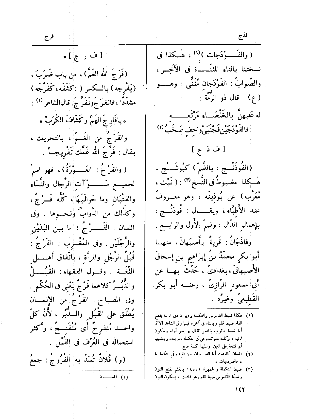 (والفَرْجُ: العَوْرَةُ) ، فَهُوَ اسْم لجَمِيع سَوْآتِ الرَّجال والنِّسَاءِ والفِتْيَانِ وَمَا حَوالَيْهَا، كُلُّه فَرْجٌ، وكذالك من الدَّوابِّ ونحوِها. وَفِي (اللِّسَان) : الفَرْجُ: مَا بَين اليَدَيْنِ والرِّجْلَيْن. وَفِي المُغْرِب: الفَرْجُ) قُبُلُ الرَّجْلِ والمرأَةِ، باتّفاق أَهلِ اللّغَة. وَقَول الفقهاءِ: القُبُلُ والدُّبُرُ كِلَاهُمَا فَرْجٌ يَعْنِي فِي الحُكْمِ. وَفِي (الْمِصْبَاح) : الفَرْجُ من الإِنسان يُطْلَق على القُبُلِ والدُّبُر، لأَنّ كلّ وَاحِد مُنفرِجٌ أَي مُنْفَتِحٌ، وأَكثر اسْتِعْمَاله فِي العُرْف فِي القُبُل.