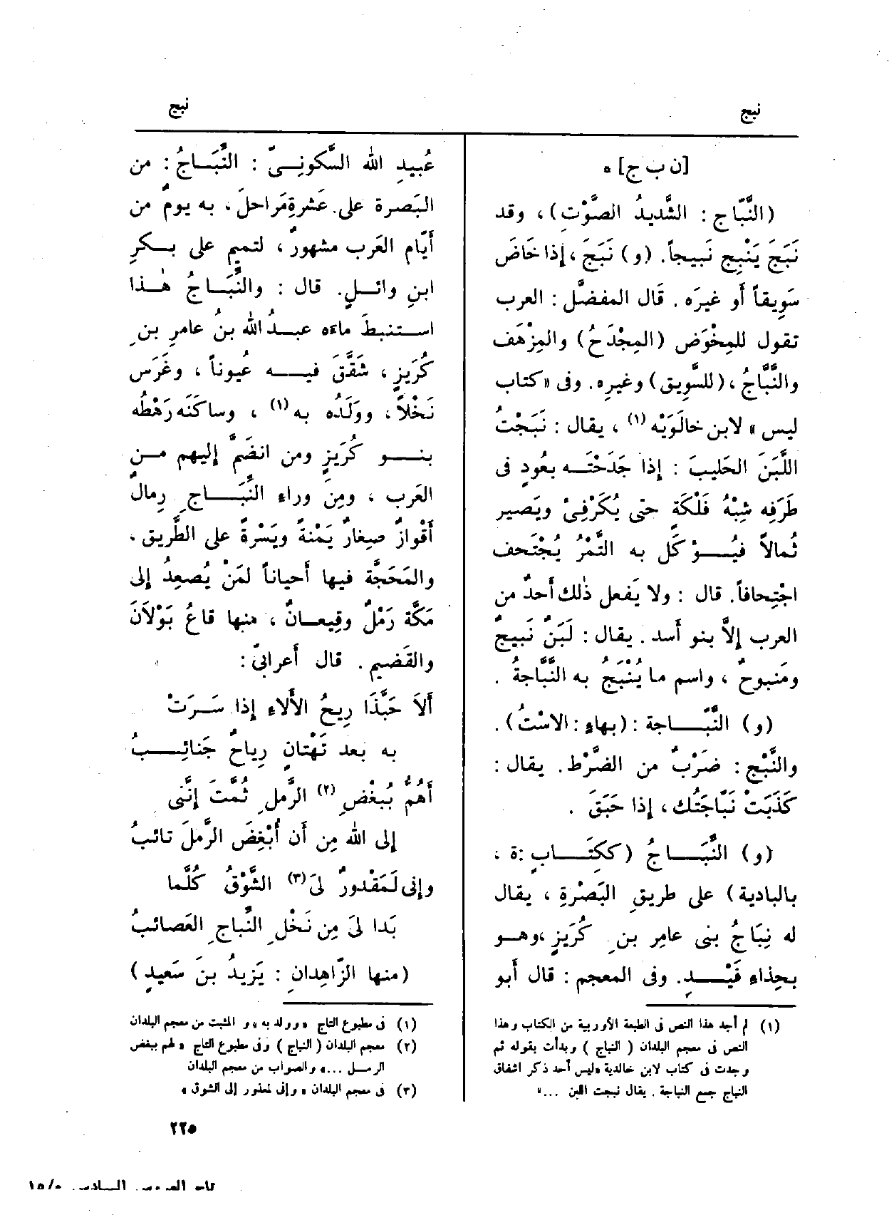 (و) النِّبَاجُ (ككِتَابٍ: ة، بالبادية) على طريقِ البَصْرَةِ، يُقَال لَهُ نِبَاجُ بني عامِر بنِ كُرَيزٍ، وَهُوَ بحِذاءِ فَيْدِ. وَفِي (المعجم) : قَالَ أَبو عُبيدِ الله السَّكونِيّ: النِّبَاجُ: من البَصرة على عشرةِ مَراحلَ، بِهِ يومٌ من أَيّام العَرب مشهورٌ، لتميم على بكرِ بنِ وائلٍ. قَالَ: والنِّبَاجُ هاذا كُرَيزٍ، شَقَّقَ فِيهِ عُيوناً، وغَرَس نَخْلاً. ووَلَدُه بِهِ، وساكَنَه رَهْطُه بن كُرَيزٍ وَمن انضَمَّ إِليهم من العَرب، ومِنَ وراءِ النِّبَاجِ رِمالٌ أَقْوَازٌ صِغَارٌ يَمْنةً ويَسْرةً على الطَّريق، والمَحَجَّة فِيهَا أَحياناً لمَنْ يُصعِدُ إِلى مَكَّة رَمْلٌ وقِيعانٌ، مِنْهَا قاعُ بَوْلاَنَ والقَضيم. قَالَ أَعرابيّ: