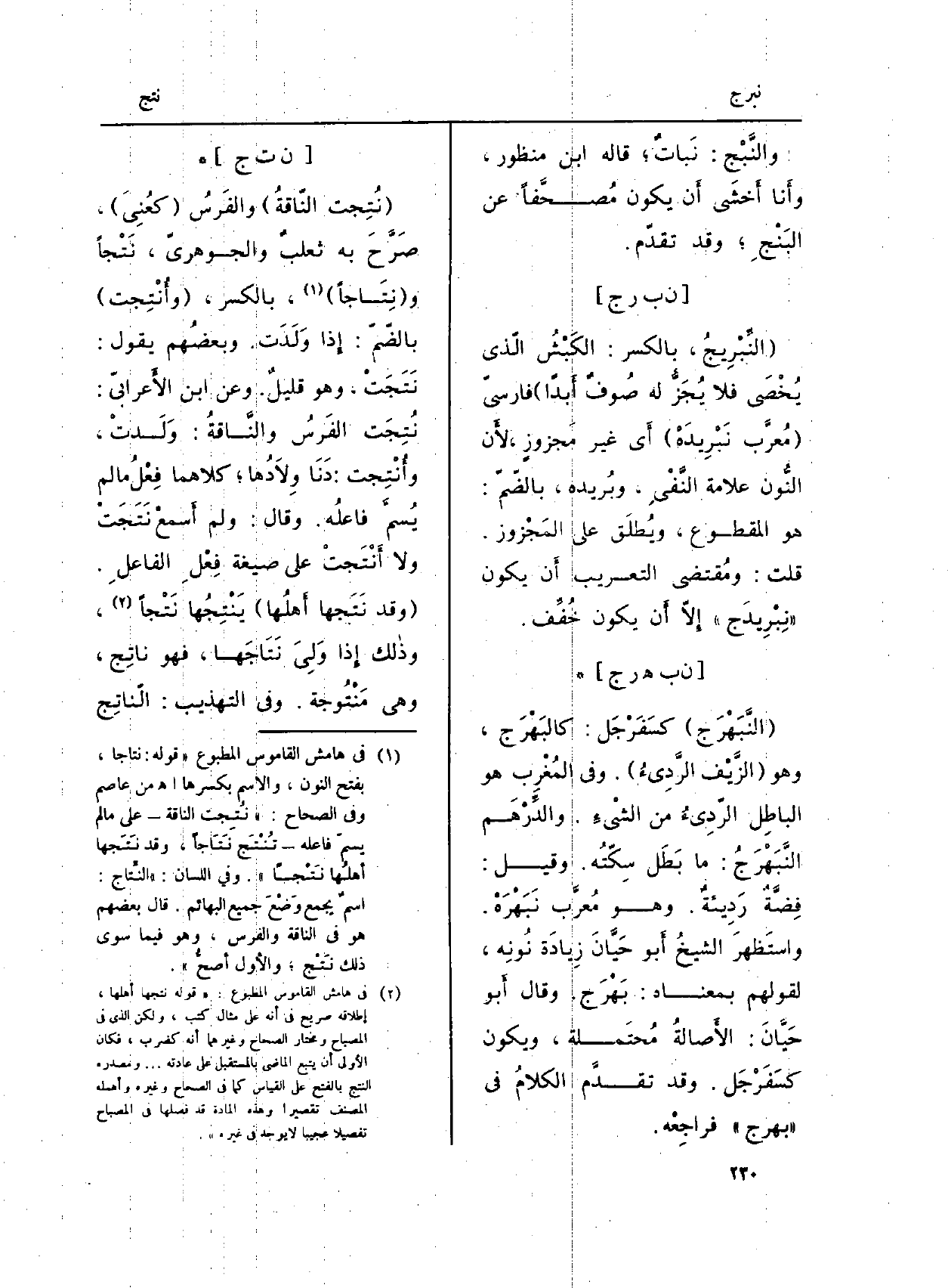 : (النِّبْرِيجُ، بِالْكَسْرِ: الكَبْشُ الّذي يُخْصَى فَلَا يُجَزُّ لَهُ صُوفٌ أَبداً) فارسيّ (مُعرَّب نَبْرِيدَهْ) أَي غير مَجزوزٍ، لأَن النُّون عَلامَة النَّفْيِ، وبُريده، بالضّمّ: هُوَ الْمَقْطُوع، ويُطلَق على المَجْزوز. قلت: ومُقتضى التعريب أَن يكون (نِبْرِيدَج) إِلاّ أَن يكون خُفِّف.