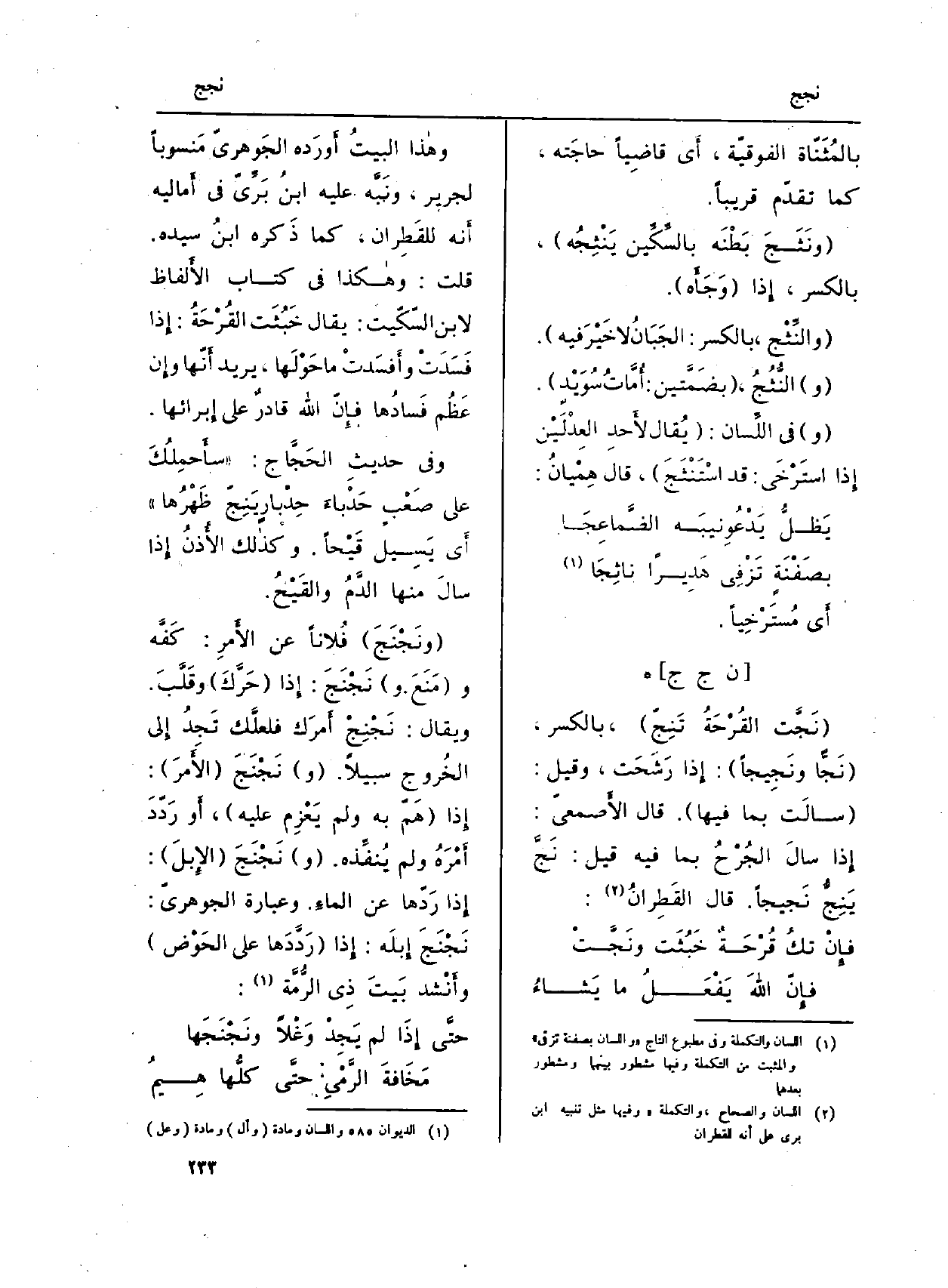 : ( {نَجَّت القُرْحَةُ} تَنِجّ) ، بِالْكَسْرِ، ( {نَجًّا} ونَجِيجاً) : إِذا رَشَحَت، وَقيل: (سالَت بِمَا فِيهَا) . قَالَ الأَصمعيّ: إِذا سالَ الجُرْحُ بِمَا فِيهِ قيل: نَجَّ {يَنِجُّ} نَجيجاً. قَالَ القَطِرانُ: