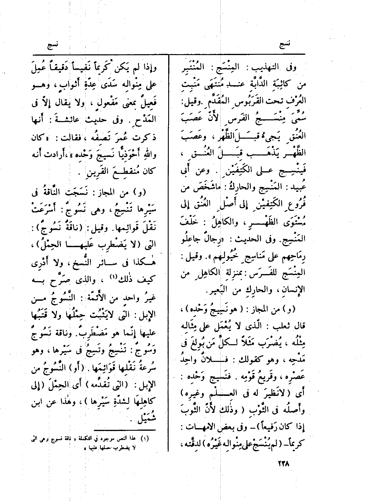 وَفِي (التَّهْذِيب) : المِنْسَج: المُنْتَبِر من كاثِبَةِ الدَّابَّةِ عِنْد مُنتَهَى مَنْبِتِ العُرْفِ تَحت القَرَبُوسِ المُقَدَّمِ. وَقيل: سُمِّيَ مِنْسَجُ الفَرسِ لأَنّ عَصَبَ العُنُقِ يَجيءُ قبلَ الظَّهْر، وعَصَبَ الظَّهْر يَذْهب قِبَلَ العُنُقِ، فَينْسِج على الكَتِفَيْنِ. وَعَن أَبي عُبيد: المَنْسِج والحارِكُ: مَا شَخَصَ من فُرُوعِ الكَتِفيْنِ إِلى أَصْلِ العُنُق إِلى مُسْتَوَى الظَهْرِ، والكاهِلُ: خَلْف المَنْسِج. وَفِي الحَدِيث: (رِجالٌ جاعِلُو رِمَاحِهم على مَناسِجِ خُيُولِهم) . وفيل: المِنْسَج للفَرَس: بمنزِلةِ الكاهِلِ من الإِنسانِ، والحارِكِ من البَعير.