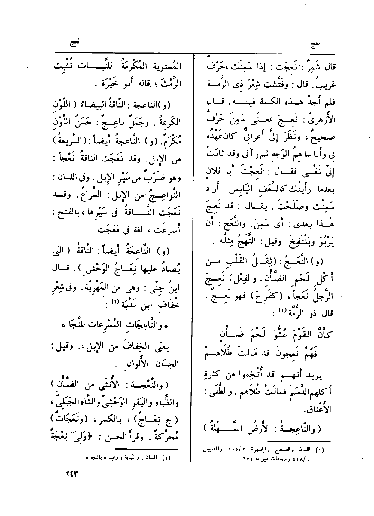 (والنُّاعِجةُ: الأَرضُ السَّهْلةُ) المُستوية المُكْرمَةُ للنَّبات تُنْبِت الرِّمْثَ؛ قَالَه أَبو خَيْرَة.