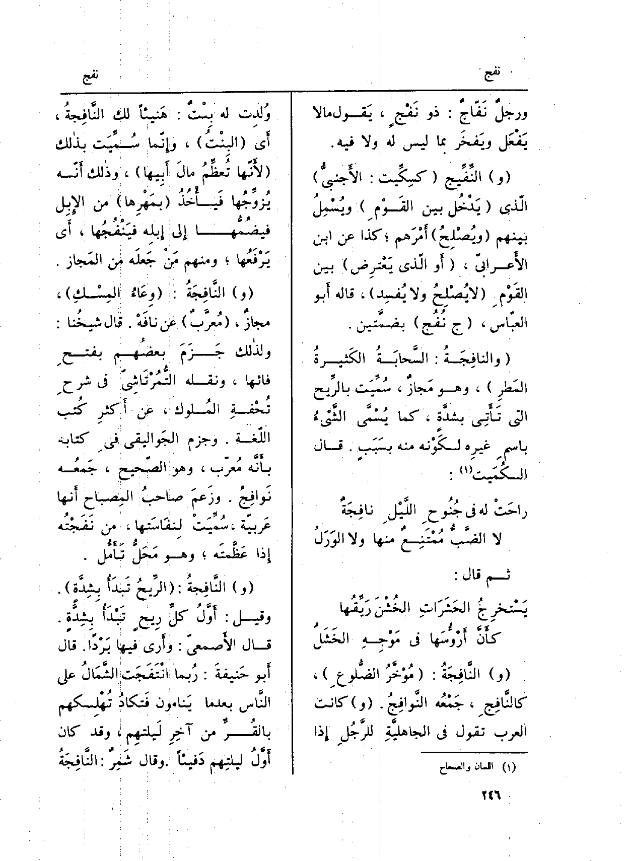 (و) النَّافِجَةُ: (وِعَاءُ المِسْكِ) ، مجازٌ. (مُعرَّبٌ) عَن نافَهْ. قَالَ شيخُنا: ولذالك جَزَمَ بعضُهم بفتحِ فائها، وَنَقله التُّمُرْتَاشِيّ فِي (شرحَ تُحْفةِ المُلوك) ، عَن أَكثر كُتب اللّغة. وَجزم الجَواليقي فِي كِتَابه بأَنَّه مُعرّب، وَهُوَ الصَّحيح، جَمعُه نَوافِجُ. وزَعمَ صاحبِ المِصباح أَنها عَربيّة، سُمِّيَتْ لِنفَاسَتها، من نَفَجْتُه إِذا عَظَّمتَه؛ وَهُوَ مَحَلُّ تَأَمُّل. .