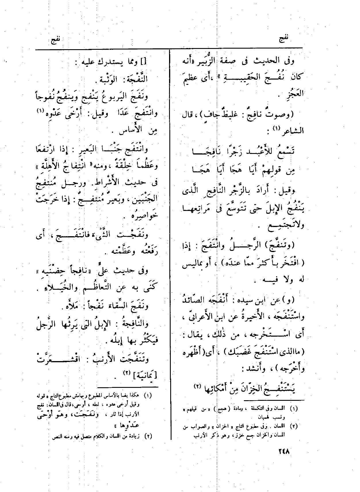 وانْتَفَج جَنْبَا البَعيرِ: إِذا ارْتفعَا وعَظُمَا خِلْقَةً، وَمِنْه (انْتِفاجُ الأَهِلَّةِ) فِي حَدِيث الأَشْراطِ. وَرجل مُنتفِجُ الجَنْبَين، وبَعيرٌ مُنتفِجٌ: إِذا خَرَجَتْ خَواصِرُه.