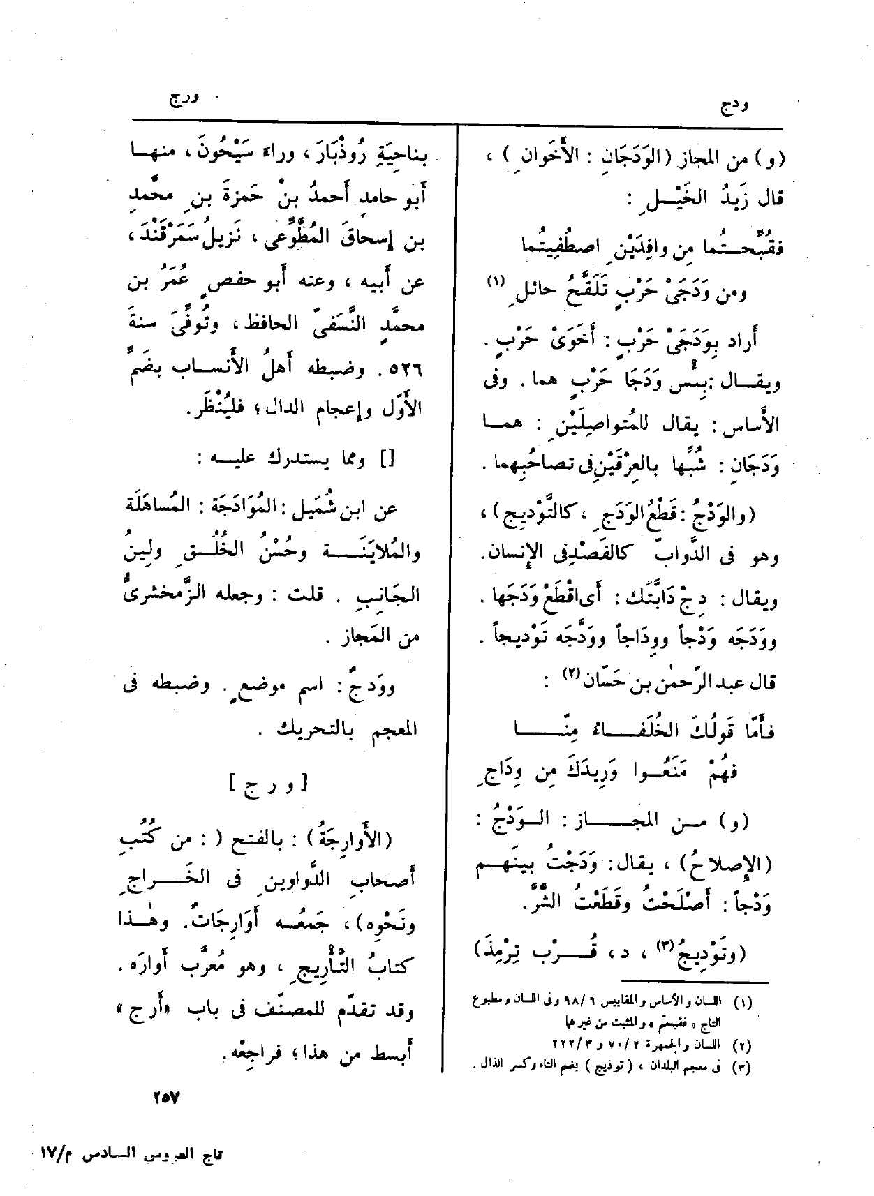 (و) من الْمجَاز (الوَدَجَانِ: الأَخَوانِ) ، قَالَ زَيدُ الخَيْلِ: