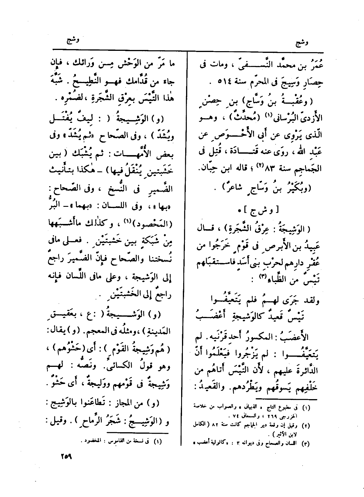 : ( {الوَشِيجَةُ: عِرْقُ الشَّجَرةِ) ، قَالَ عَبِيدُ بن الأَبرصِ فِي قَوْمٍ خَرَجُوا من عُقْرِ دارِهم لحرْبِ بني أَسَدٍ فاستقبَلهم تَيْسٌ من الظِّباءِ: