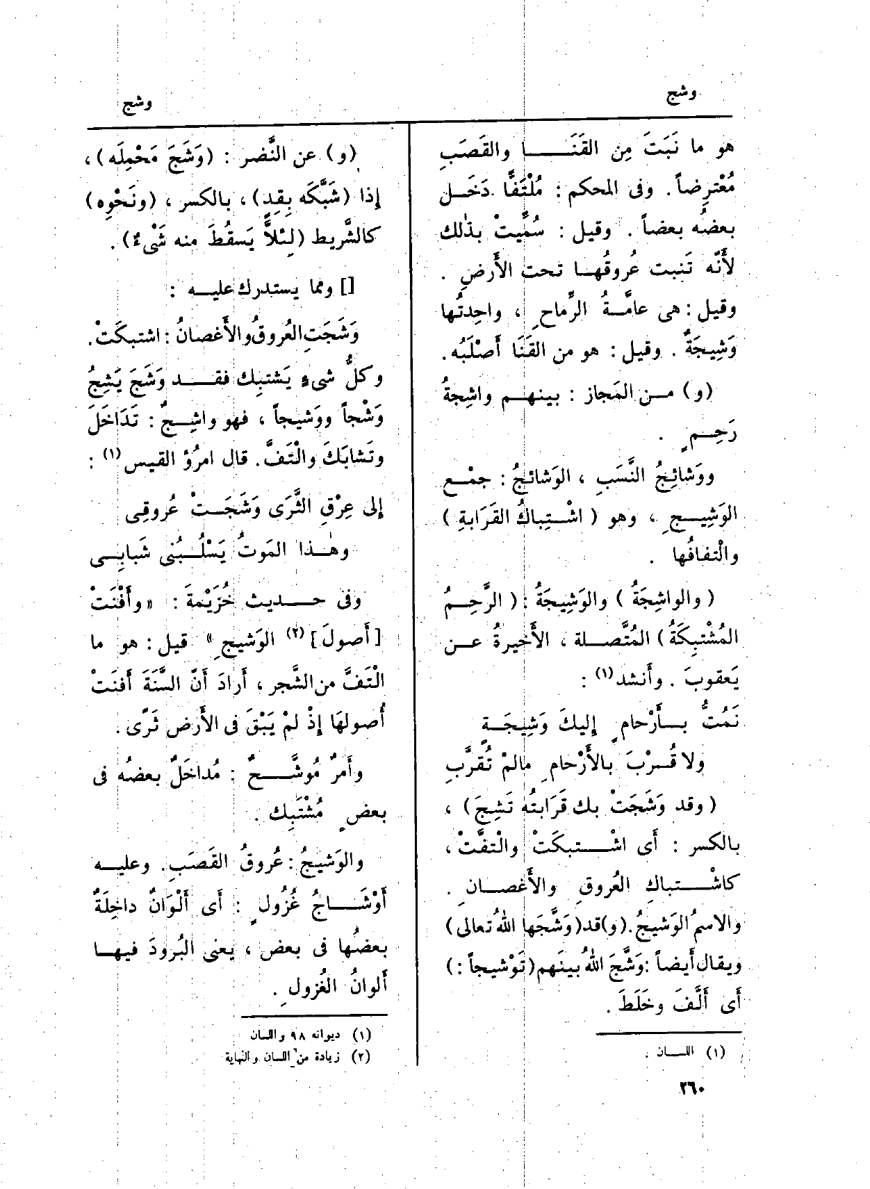 هُوَ مَا نَبَتَ مِن القَنَا والقَصَبِ مُعْتَرِضاً. وَفِي (الْمُحكم) : مُلْتَفًّا دَخَل بَعضُه بَعْضًا. وَقيل: سُمِّيتْ بذالك لأَنّه تَنبت عُروقُها تَحت الأَرضِ. وَقيل: هِيَ عامَّةُ الرِّماحِ، واحِدتُها وَشِيجَةٌ. وَقيل: هُوَ من القَنَا أَصْلَبُه.