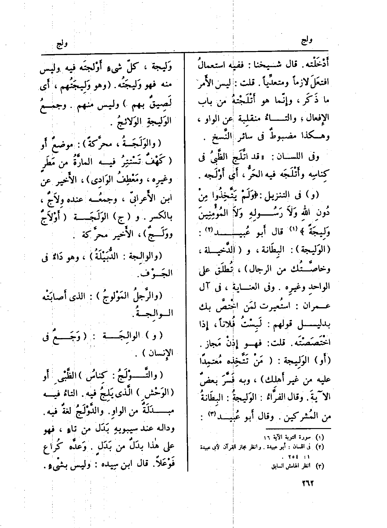 (و) فِي التَّنْزِيل: {وَلَمْ يَتَّخِذُواْ مِن دُونِ اللَّهِ وَلاَ رَسُولِهِ وَلاَ الْمُؤْمِنِينَ {وَلِيجَةً} (التَّوْبَة: 16) قَالَ أَبو عُبيد: (} الوَليجة) : البِطَانة، و (الدَّخيلة، وخاصَّتُك من الرِّجَال) ، تُطلَق على الواحدِ وغيرهِ. وَفِي الْعِنَايَة، فِي آل عمرَان: استُعيرت لمَنْ اخْتَصَّ بك بِدَلِيل قَوْلهم: لَبِسْتُ فُلاناً، إِذا اخْتَصَصْتَه. قلت: فَهُوَ إِذنْ مَجاز. (أَو) الوَلِيجة: (مَنْ تَتَّخِذه مُعتمِداً عَلَيْهِ من غير أَهلِك) ، وَبِه فَسَّرَ بعضٌ من المُشركين. وَقَالَ أَبو عُبيد: وَليجة، كلّ شيءٍ {أَوْلجتَه فِيهِ وَلَيْسَ مِنْهُ فَهُوَ وَليجَتُه. (وَهُوَ} وَلِيجَتُهم، أَي لَصِيقٌ بهم) وَلَيْسَ مِنْهُم. وجمعُ {الوَليجةِ} الوَلائجُ.