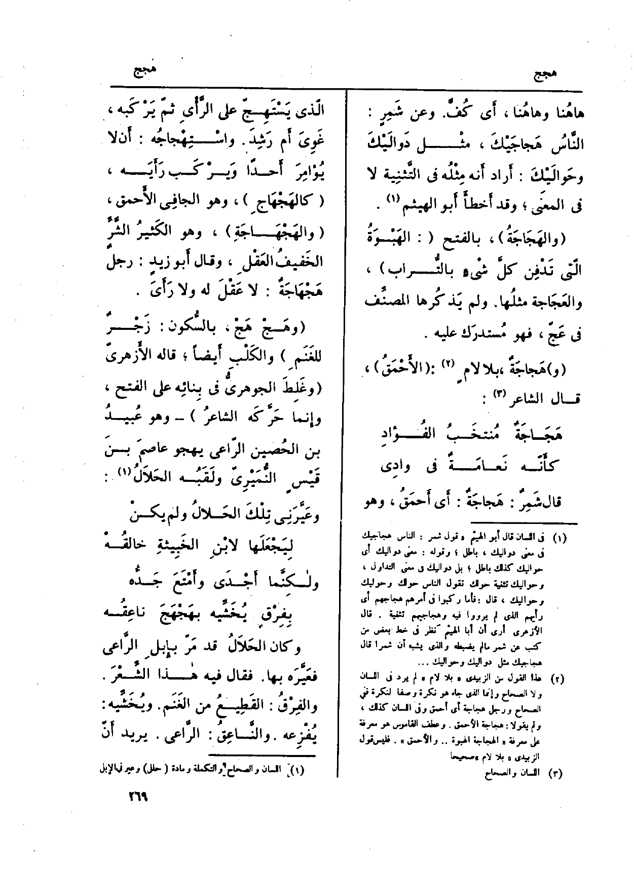 قَالَ شَمِرٌ: هَجاجَةٌ: أَي أَحمَقُ، وَهُوَ الّذي يَسْتَهِجّ على الرَّأْيِ ثمّ يَرْكَبه، غَوِيَ أَم رَشِدَ. واسْتِهْجاجُه: أَن لَا يُؤامِرَ أَحداً ويَرْكَب رَأَيَه، ( {كالهَجْهَاجِ) ، وَهُوَ الجافِي الأَحمق، (} والهَجْهَاجَةِ) ، وَهُوَ الكَثيرُ الشَّرِّ الخَفيفُ العَقْلِ، وَقَالَ أَبو زيدٍ: رجلٌ {هَجْهَاجَةٌ: لَا عَقْلَ لَهُ وَلَا رَأَيَ.