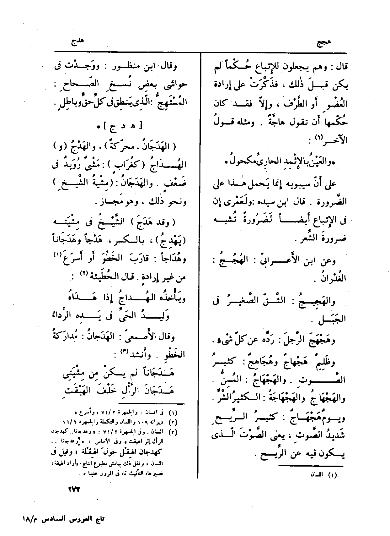 : (الهَدَجَانِ، محرّكةً) ، والهَدْجُ (و) الهُدَاجُ (كغُرَابٍ) : مَشْيٌ رُوَيدٌ فِي ضَعْفٍ. والهَدَجَانُ: (مِشْيةُ الشَّيخِ) وَنَحْو ذالك، وَهُوَ مَجاز.