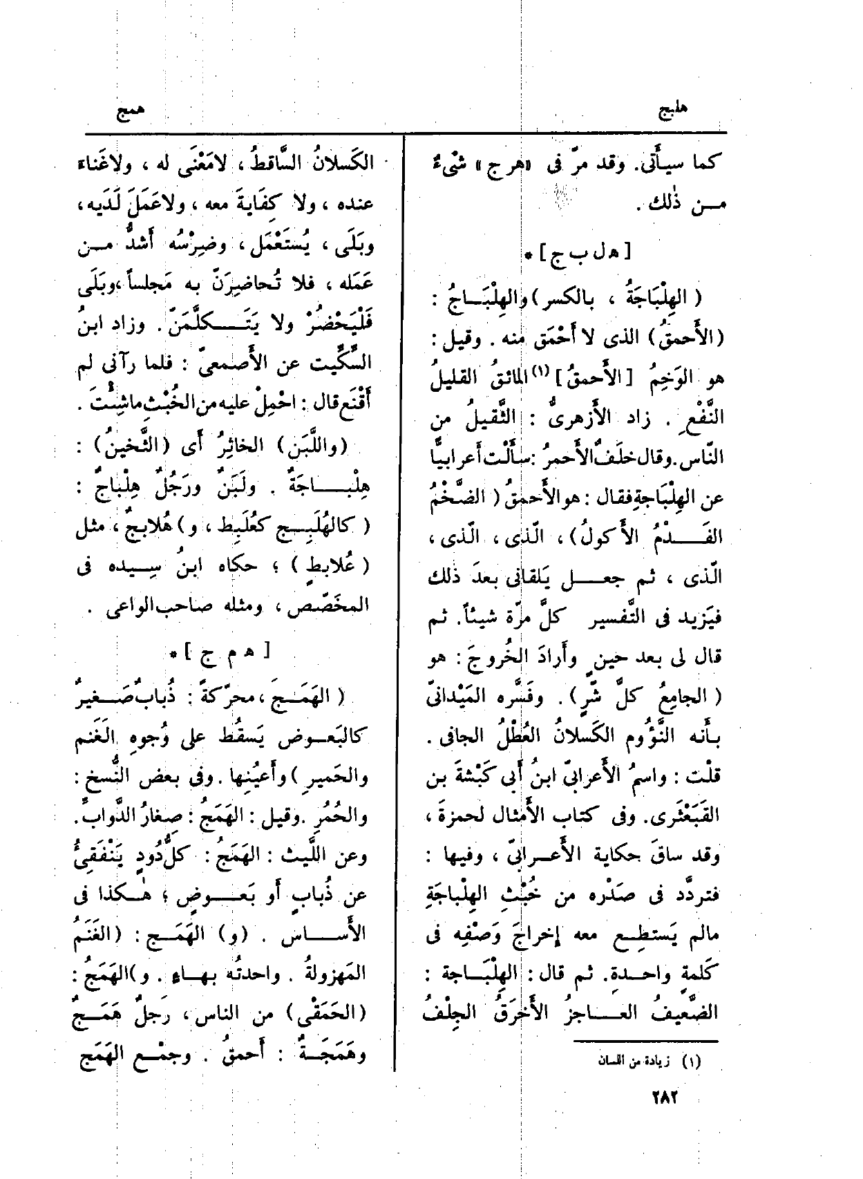 (واللَّبَن) الخاثِرُ أَي (الثَّخينُ) : هِلْباجَةٌ. ولَبَنٌ ورَجُلٌ هِلْباجٌ: (كالهُلَبِج كعُلَبِط، و) هُلابجٌ، مثل (عُلابطٍ) ؛ حَكَاهُ ابنُ سِيده فِي المخَصّص، وَمثله صَاحب الواعي.