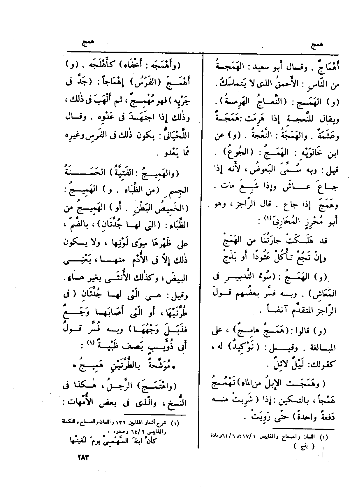 (والهَمِيجُ: الفَتِيَّةُ) الحَسَنَةُ الجِسمِ (من الظِّبَاءِ. و) الهَمِيجُ: (الخَمِيصُ البَطْنِ. أَو) الهَمِيجُ من الظِّبَاءِ: (الَّتِي لَهَا جُدَّتَانِ) ، بالضَّمّ، على ظَهْرهَا سِوَى لَوْنِها، وَلَا يكون ذالك إِلاّ فِي الأُدْم مِنْهَا، يَعْنِي البيضَ؛ وكذالك الأُنثَى بِغَيْر هاءٍ. وَقيل: هِيَ الّتي لَهَا جُدَّتَانِ (فِي طُرَّتَيْهَا. أَو الّتي أَصَابَها وَجَمٌ فذَبَلَ وَجْهُهَا) وَبِه فُسِّر قولُ أَبي ذُؤَيبٍ يَصف ظَبْيةً: