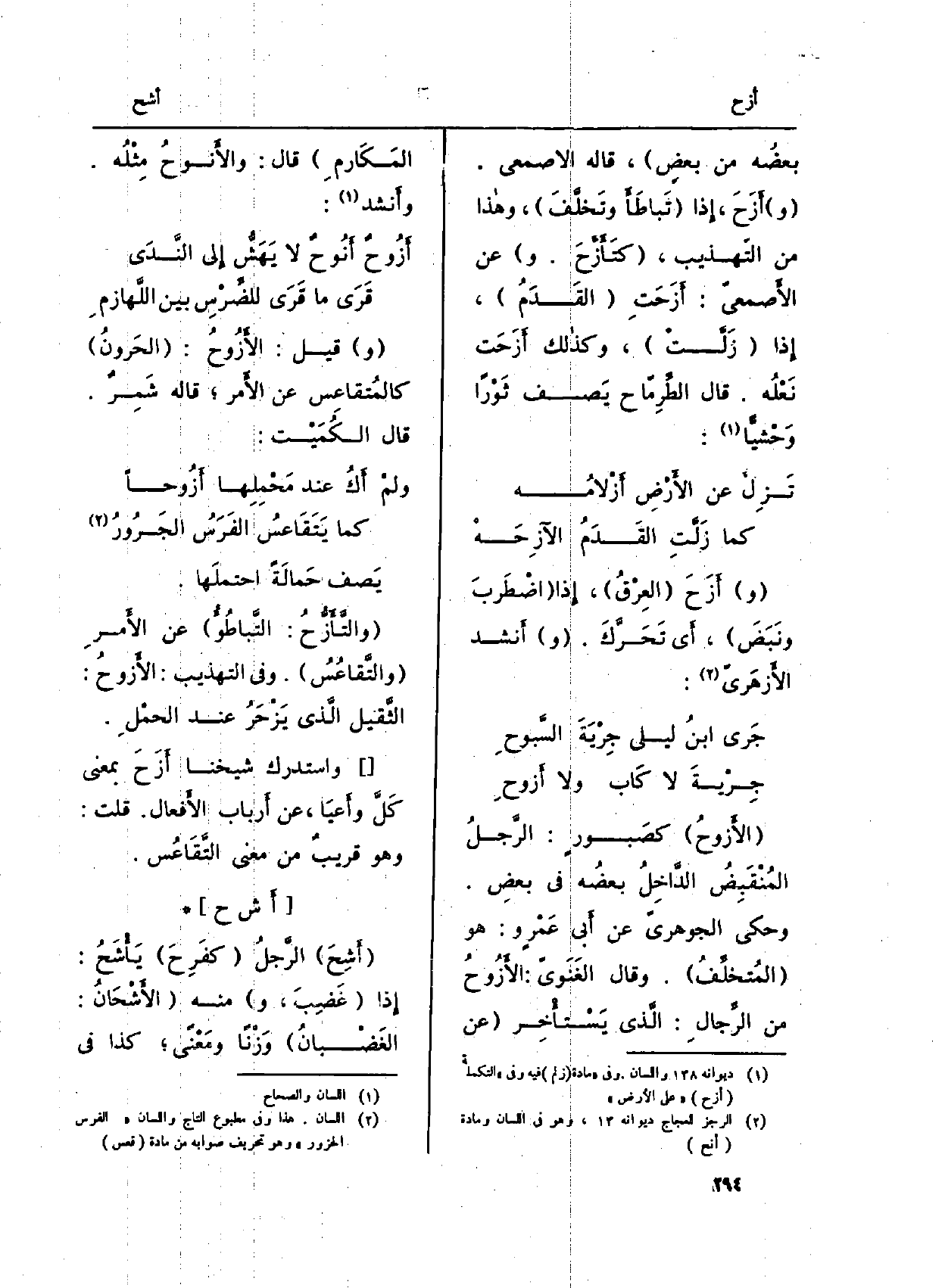 بعضُه من بعضٍ) ، قَالَه الأَصمعيّ. (و) {أَزَحَ، إِذا (تَباطَأَ وتَخلَّفَ) ، وهاذا من التّهذيب، (} كتَأَزَّحَ. و) عَن الأَصمعيّ: أَزَحَتِ (القَدَمُ) ، إِذا (زَلَّتْ) ، وكذالك {أَزَحَت نَعْلُه. قَالَ الطِّرِمّاح يَصف ثَوْراً وَحْشيًّا: