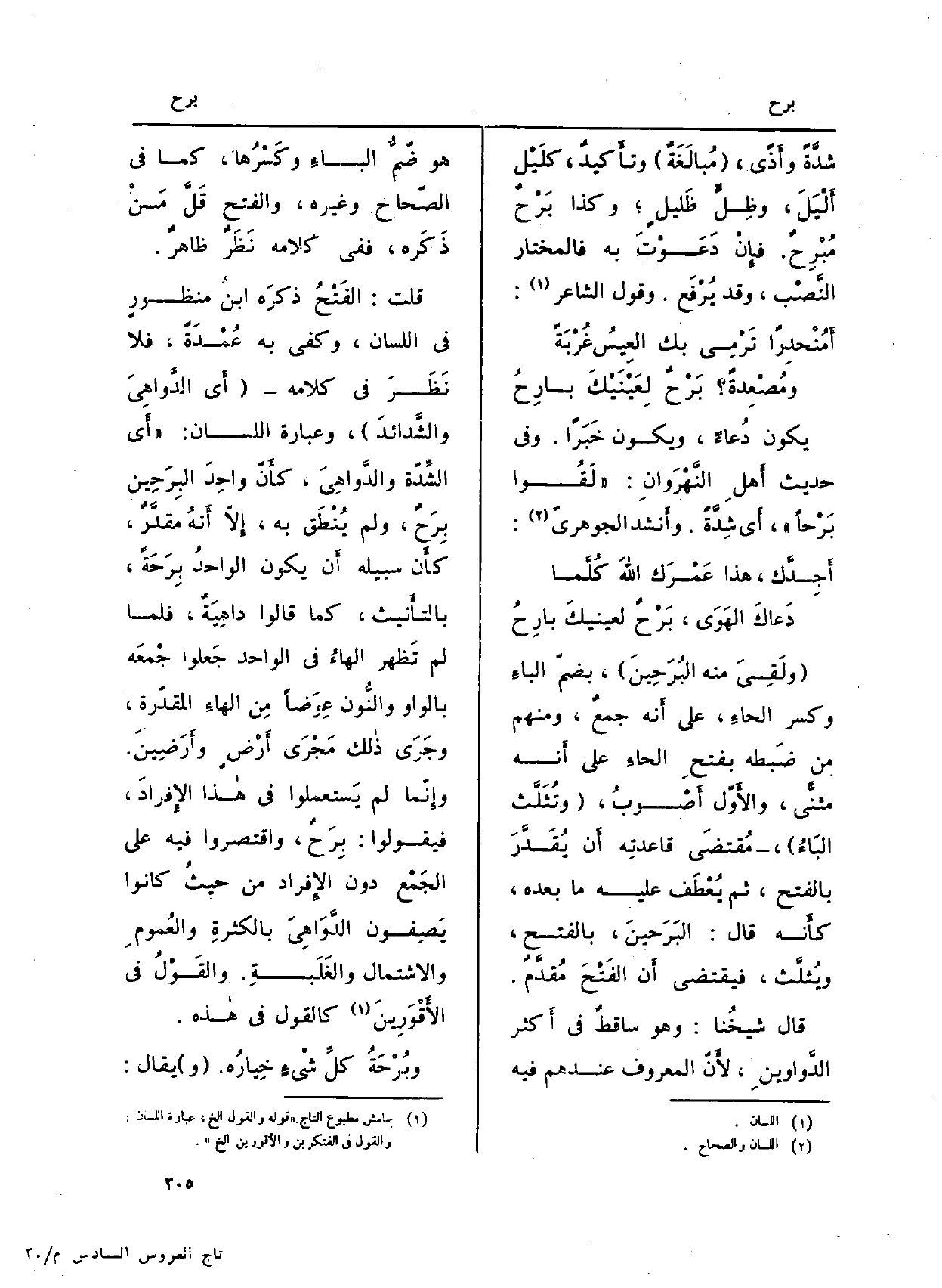 قلت: الفَتْحُ ذكرَه ابنُ منظورٍ فِي (اللِّسَان) ، وكفي بِهِ عُمْدَةً، فَلَا نَظَرَ فِي كَلَامه (أَي الدَّواهِيَ والشَّدائدَ) ، وَعبارَة (اللِّسَان) : (أَي الشِّدّة والدَّواهِيَ، كأَنّ واحِدَ البِرَحِين بِرَحٌ، وَلم يُنْطَق بِهِ، إِلاّ أَنه مقدَّرٌ، كأَن سَبيله أَن يكون الواحدُ بِرَحَةً، بالتأَنيث، كَمَا قَالُوا داهِيَةٌ، فَلَمَّا لم تَظهر الهاءُ فِي الْوَاحِد جَعلوا جمْعَه بِالْوَاو والنُّون عِوَضاً مِن الهاءِ المقدّرة، وجَرَى ذالك مَجْرَى أَرْضٍ وأَرَضِينَ وإِنّما لم يَستعملوا فِي هاذا الإِفرادَ، فيقولوا: بِرَحٌ، واقتصروا فِيهِ على الجَمْع دون الإِفراد من حيثُ كَانُوا يَصِفون الدَّوَاهِيَ بالكثرةِ والعُمُومِ والاشتمال والغَلَبَةِ. والقَوْلُ فِي الأَقْوَرِينَ كالقول فِي هاذه.