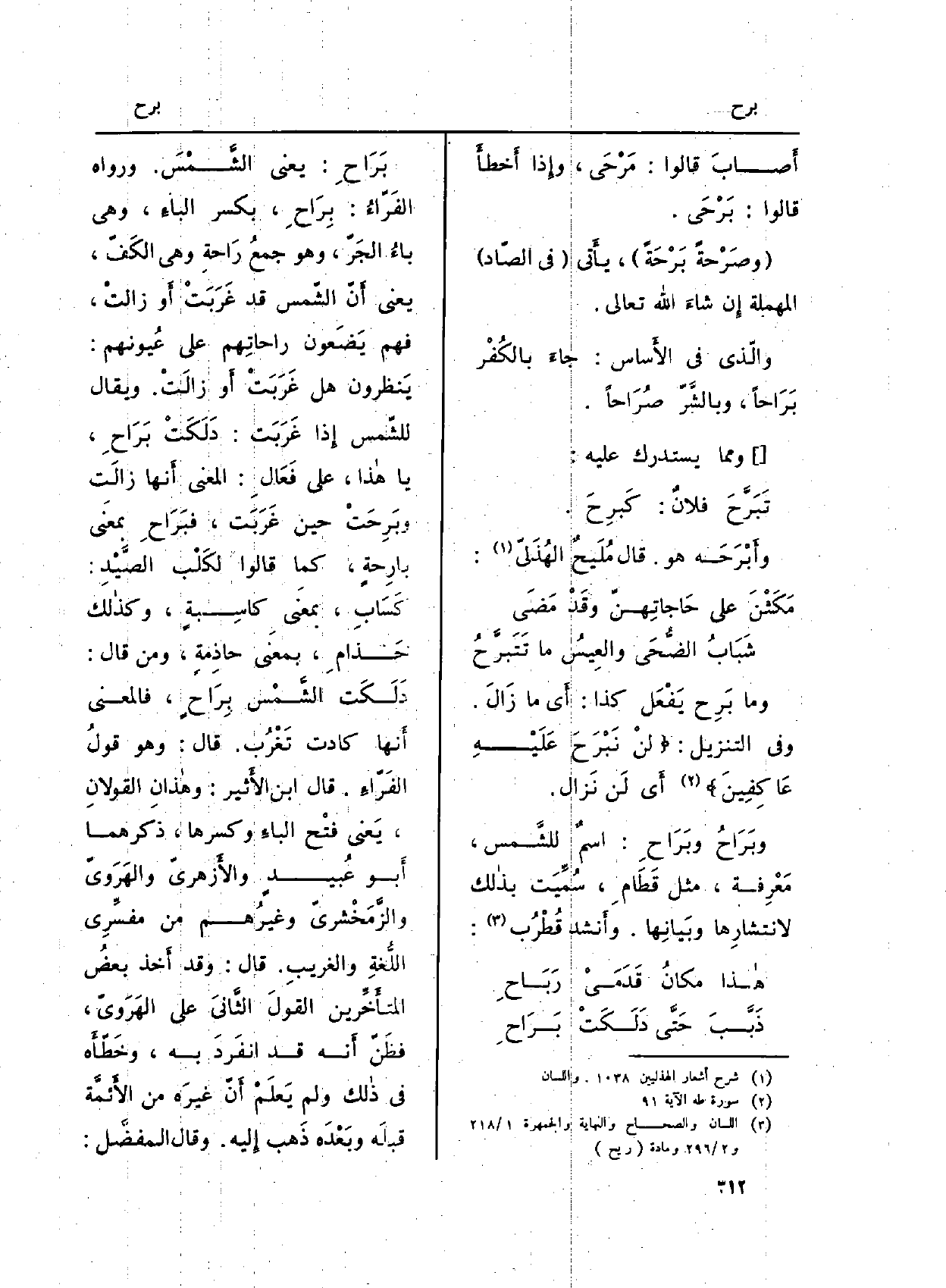 بَرَاحِ: يَعْنِي الشَّمْسَ. وَرَوَاهُ الفَرّاءُ: بِرَاحِ، بِكَسْر الباءِ، وَهِي باءُ الجَرّ، وَهُوَ جمعُ رَاحةٍ وَهِي الكَفّ، يَعْنِي أَنّ الشّمس قد غَرَبَتْ أَو زالتْ، فهم يَضَعون راحاتِهم على عُيُونهم: يَنظرون هَل غَرَبَتْ أَو زالَتْ. وَيُقَال للشّمس إِذا غَرَبَت: دَلَكَتْ بَرَاحِ، يَا هاذا، على فَعَالِ: الْمَعْنى أَنها زالَت وبَرِحَتْ حِين غَرَبَت، فبَرَاحِ بِمَعْنى بارِحةً، كَمَا قَالُوا لكَلْب الصَّيْدِ: كَسَابِ، بمعنَى كاسِبةٍ، وكذالك حَذامِ، بمعنَى حاذِمةٍ، وَمن قَالَ: دَلَكَتْ الشَّمْس بِرَاحٍ، الْمَعْنى أَنها كَادَت تَغْرُب. قَالَ: وَهُوَ قولُ الفَرّاءِ. قَالَ ابْن الأَثير: وهاذانِ القولانِ، يَعني فتْح الباءِ وَكسرهَا، ذكرهمَا أَبو عُبيدٍ والأَزهريّ والهَرَويّ والزَّمَخْشَريّ وغيرُهم من مفسِّرِي اللُّغةِ والغريبِ. قَالَ: وَقد أَخذ بعضُ المتأَخِّرين القولَ الثَّانيَ على الهَرَويّ، فظَنّ أَنه قد انفَرَدَ بِهِ، وخَطّأَه فِي ذالك وَلم يَعلَمْ أَنْ غيرَه من الأَئمَّة قبلَه وبَعْدَه ذَهب إِليه. وَقَالَ المفضَّل: