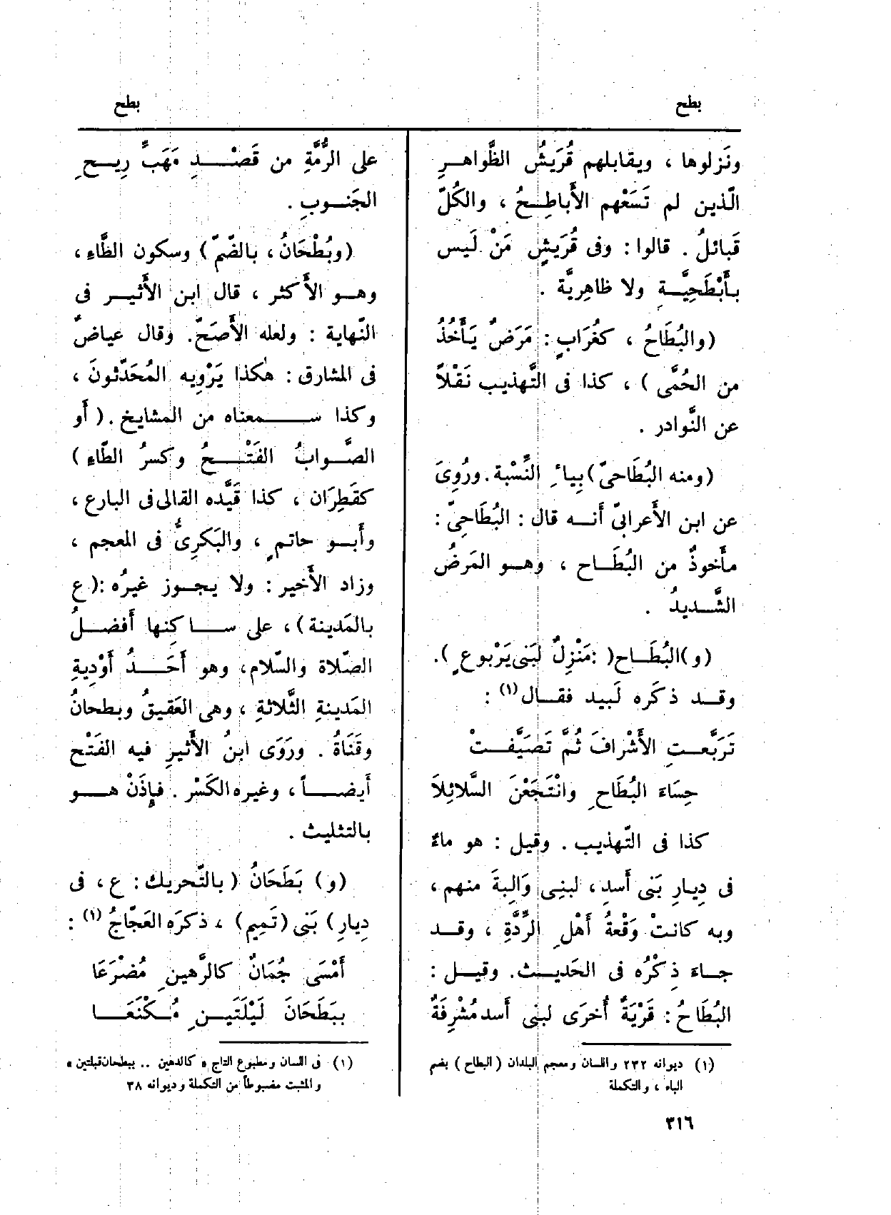 (وبُطْحَانُ، بالضّمّ) وَسُكُون الطَّاءِ، وَهُوَ الأَكثر، قَالَ ابْن الأَثير فِي النّهاية: وَلَعَلَّه الأَصَحّ. وَقَالَ عياضٌ فِي الْمَشَارِق: هاكذا يَرْوِيه يَرْوِيه المُحَدّثونَ، وَكَذَا سمعناه من الْمَشَايِخ. (أَو الصَّوابُ الفَتْحُ وكسرُ الطّاءِ) كقَطِرَان، كَذَا قَيَّده القالي فِي البارع، وأَبو حاتمٍ، والبَكرِيُّ فِي (المعجم) ، وَزَاد الأَخير: وَلَا يجوز غيرُه: (ع بالمَدينة) ، على ساكِنها أَفضلُ الصّلاة والسَّلام، وَهُوَ أَحَدُ أَوْدِيةِ المَدينةِ الثَّلاثةِ، وَهِي العَقِيقُ وبطحانِ وقَنَاةُ. ورَوَى ابنُ الأَثيرِ فِيهِ الفَتْح أَيضاً، وَغَيره الكَسْر. فإِذَنْ هُوَ بالتثليث.