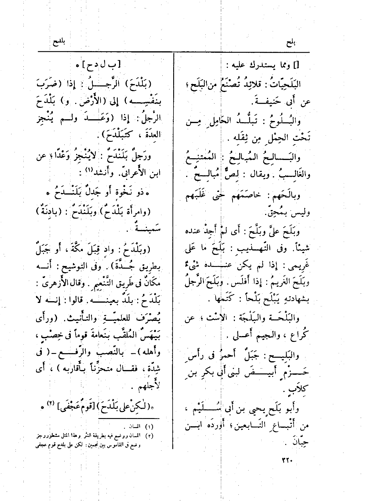 وبَلَحَ عليَّ وبَلَّحَ: أَي لمْ أَجِدْ عِنْده شَيْئا. وَفِي (التَّهْذِيب) : بَلَحَ مَا عَلى غَرِيمي: إِذ لم يكن عِنْده شيْءٌ وبَلَحَ الغَريمُ: إِذا أَفلَس. وبَلَحَ الرَّجلُ بشهادتهِ يَبْلَح بَلْحاً: كَتَمها.