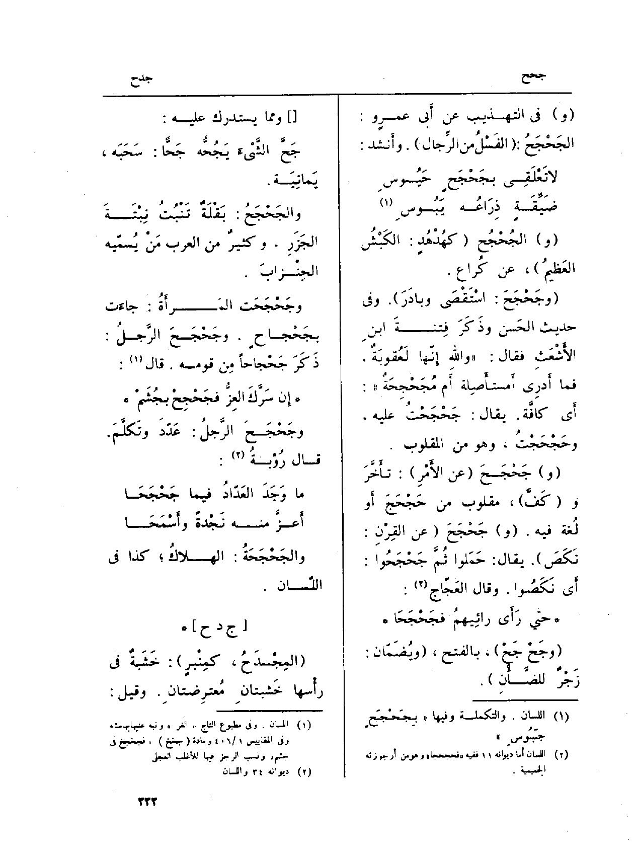 } وجَحْجَحَ الرَّجلُ: عَدّدَ وتَكلَّمَ. قَالَ رُؤبةُ: