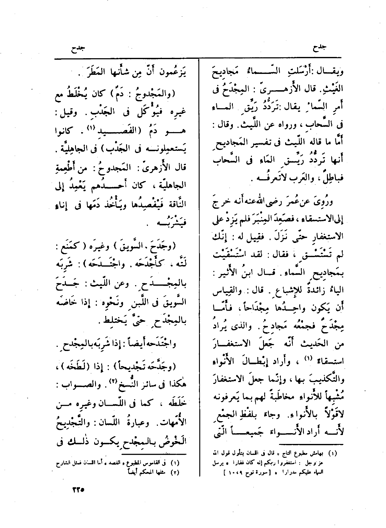 ورُوِيَ عَن عُمرَ رَضِي الله عَنهُ أَنه خرجَ إِلى الاستسقاءِ، فصَعِدَ المِنْبَرَ فَلم يَزِدْ على الاستغفارِ حتّى نَزَلَ. فقِيل لَهُ: إِنّك لم تَسْتَسْقِ، فَقَالَ: لقد اسْتَسْقَيْت بمَجادِيحِ السَّماءِ. قَالَ ابنُ الأَثير: الياءُ زائدةٌ للإِشباعِ. قَالَ: والقِياس أَن يَكون واحِدُها مُجْدَاحاً، فأَمّا مِجْدَحٌ فجمْعُه مَجادِحُ. وَالَّذِي يُرادُ من الحَديث أَنّه جَعلَ الاستغفارَ استسقاءً، وأَراد إِبْطالَ الأَنْواءِ والتَّكذيبَ بهَا، وإِنّما جعلَ الاستغفارَ مُشْبِهاً للأَنواءِ مخاطَبةً لَهُم بِمَا يَعرفونه لَا قَوْلاً بالأَنواءِ. وجاءَ بلفْظِ الجمْعِ لأَنه أَراد الأَنواءَ جَميعاً الّتي يَزْعُمون أَنّ مِن شأَنها المَطَرَ.