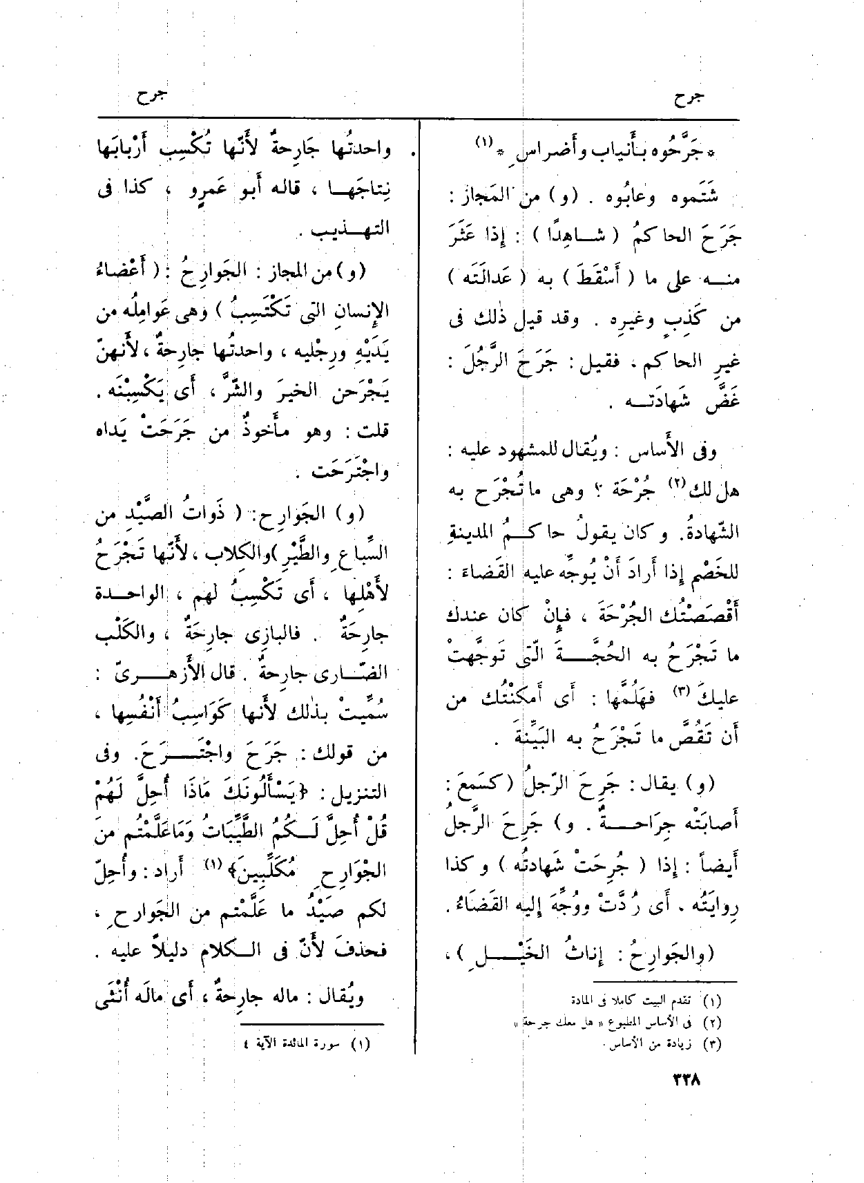 (و) الجَوارِح: (ذَواتُ الصَّيْدِ من السِّباعِ والطَّيْرِ) والكِلاب، لأَنّها تَجْرَحُ لأَهْلِها، أَي تَكْسِبُ لَهُم، الْوَاحِدَة جارِحَةٌ. البازِي جارحَةٌ، والكَلْب الضّاري جارِحةٌ، والكَلْب الضّاري جارِحةٌ. قَالَ الأَزهريّ: سُمِّيتْ بذالك لأَنها كَوَاسِبُ أَنْفُسِها، من قَوْلك: جَرَحَ واجْتَرَحَ. وَفِي التَّنْزِيل: {6. 019 يساءَلونك مَاذَا اءَحل. . مكلبين} (الْمَائِدَة: 4) أَراد: وأَحِلّ لكم صَيْدُ مَا عَلَّمْتم من الجَوارحِ، فحذفَ لأَنّ فِي الْكَلَام دَلِيلا عَلَيْهِ.